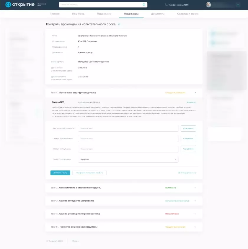 Интранет упрощает работу руководителей, позволяет им ставить задачи на одного или нескольких сотрудников сразу, комментировать задачи и экспортировать их в EXCEL для печати внутренних документов. По окончании испытательного срока руководитель оценивает и принимает решение о дальнейшем найме прямо в интерфейсе.