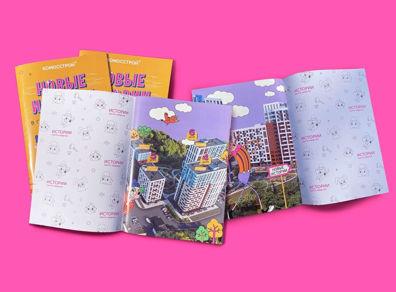 Буклет мы сделали интерактивным, добавив раскраску для детей. Рендеры «оживили», соединив с иллюстрациями, а жизненные сюжеты будущих покупателей раскрыли через маленькие истории семьи Дрюгге, уже ставшей такой «своей».