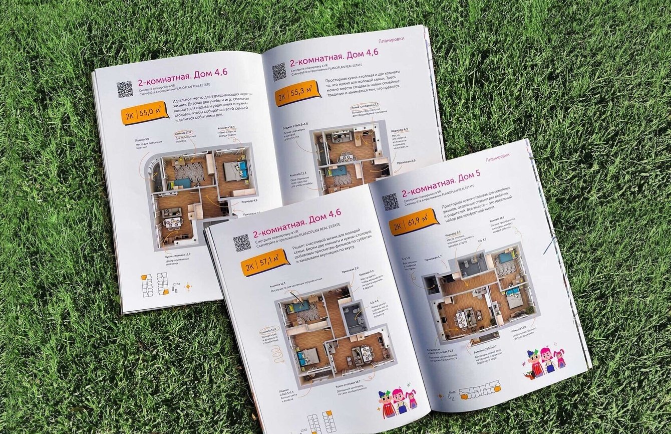 Даже планировки в буклете можно показать через эмоцию. Мы предложили написать свою историю в новом доме: вот тут можно отпраздновать новоселье, тут — устроить веселые старты, а здесь — сделать маску, пока ребенок купается…