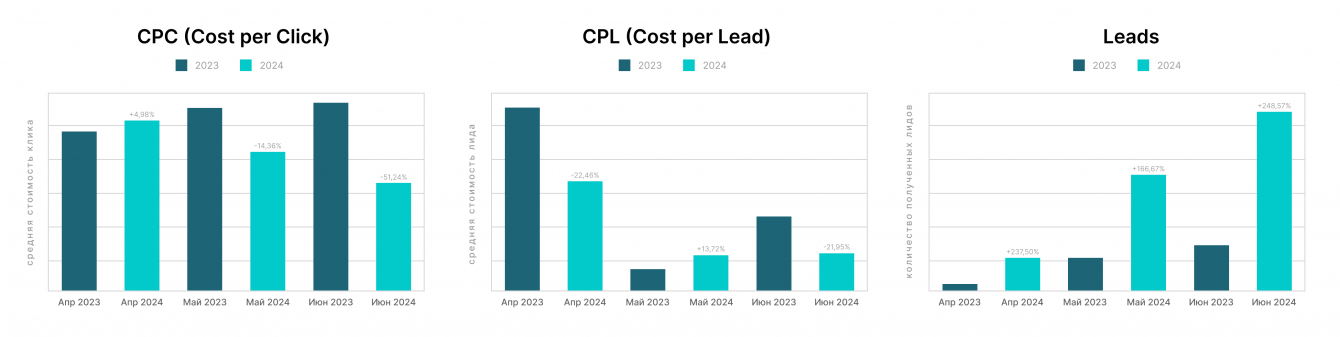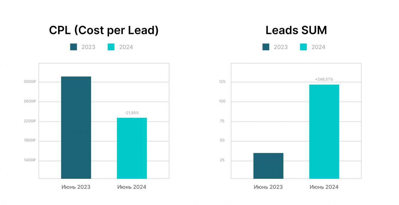 Мы продолжаем активно мониторить кампании и заниматься их оптимизацией на поиске и в сетях. Получается хорошо, даже лучше, чем в те же месяцы год назад. Если, например, поставить рядом данные июня 2023 и июня 2024 — получится бирюзовая эстетика: