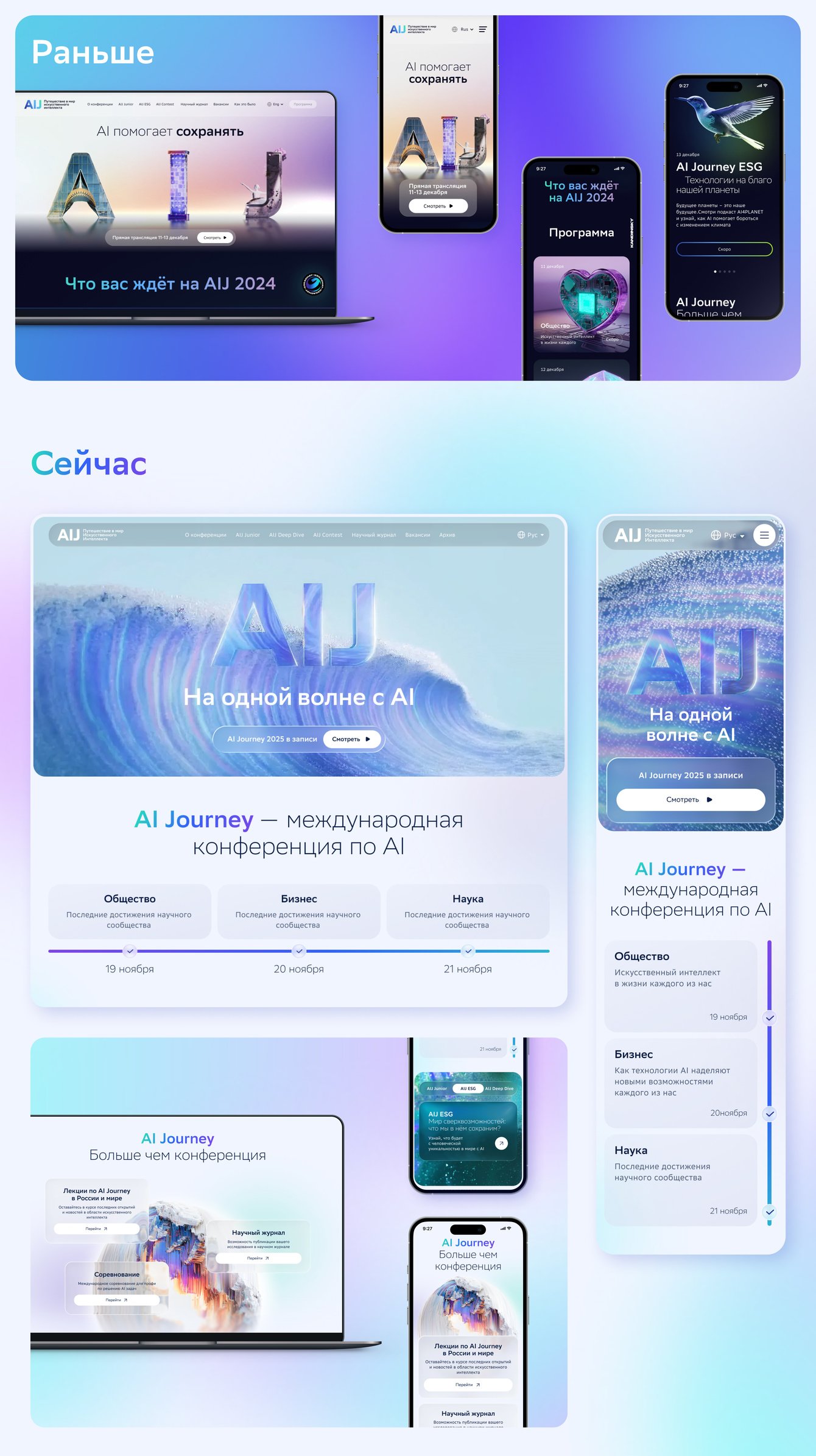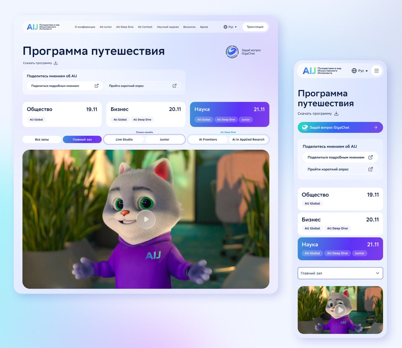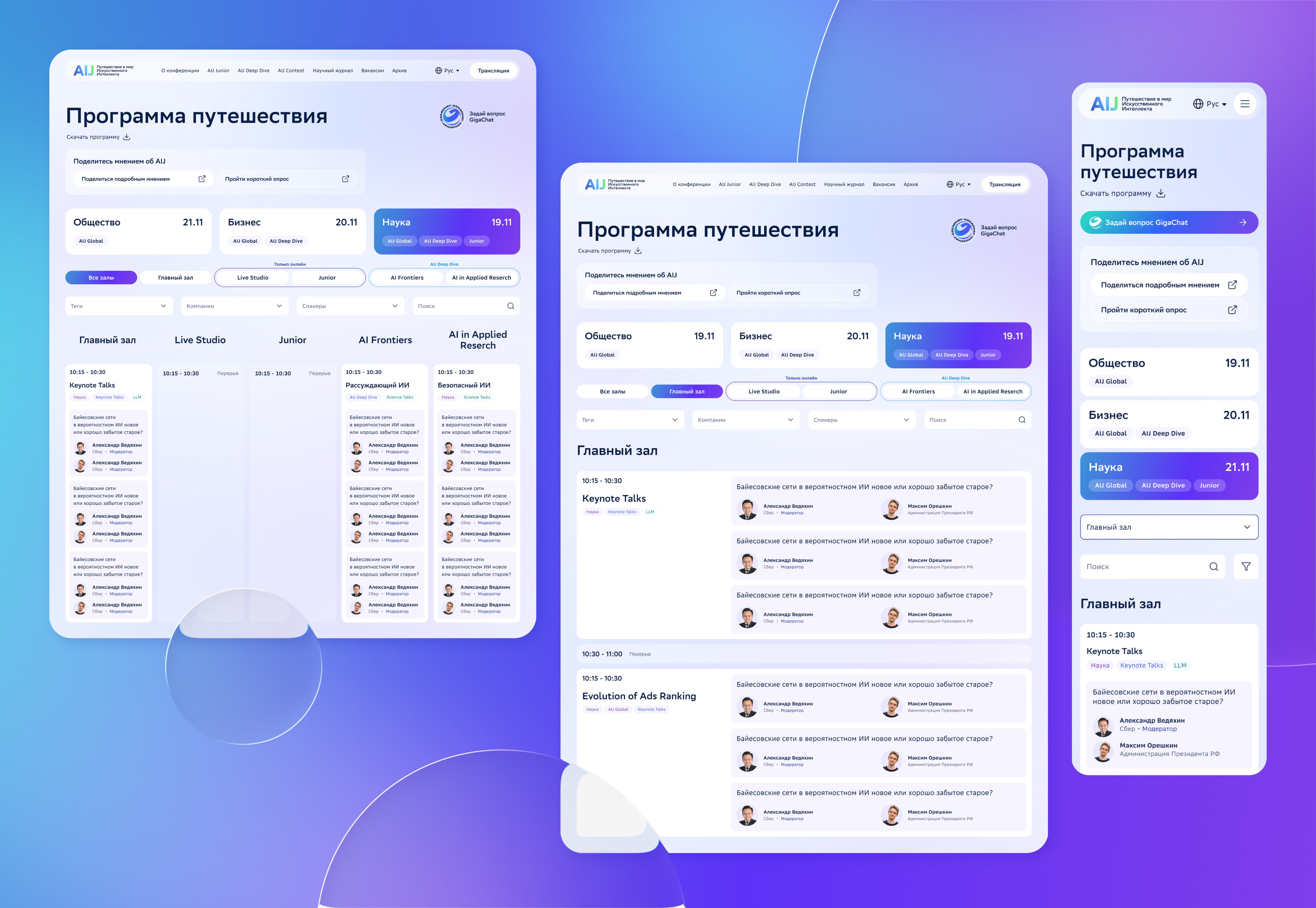 AI Journey — это десятки сессий в день и пять параллельных залов. Нам было важно, чтобы пользователь быстро ориентировался и понимал: