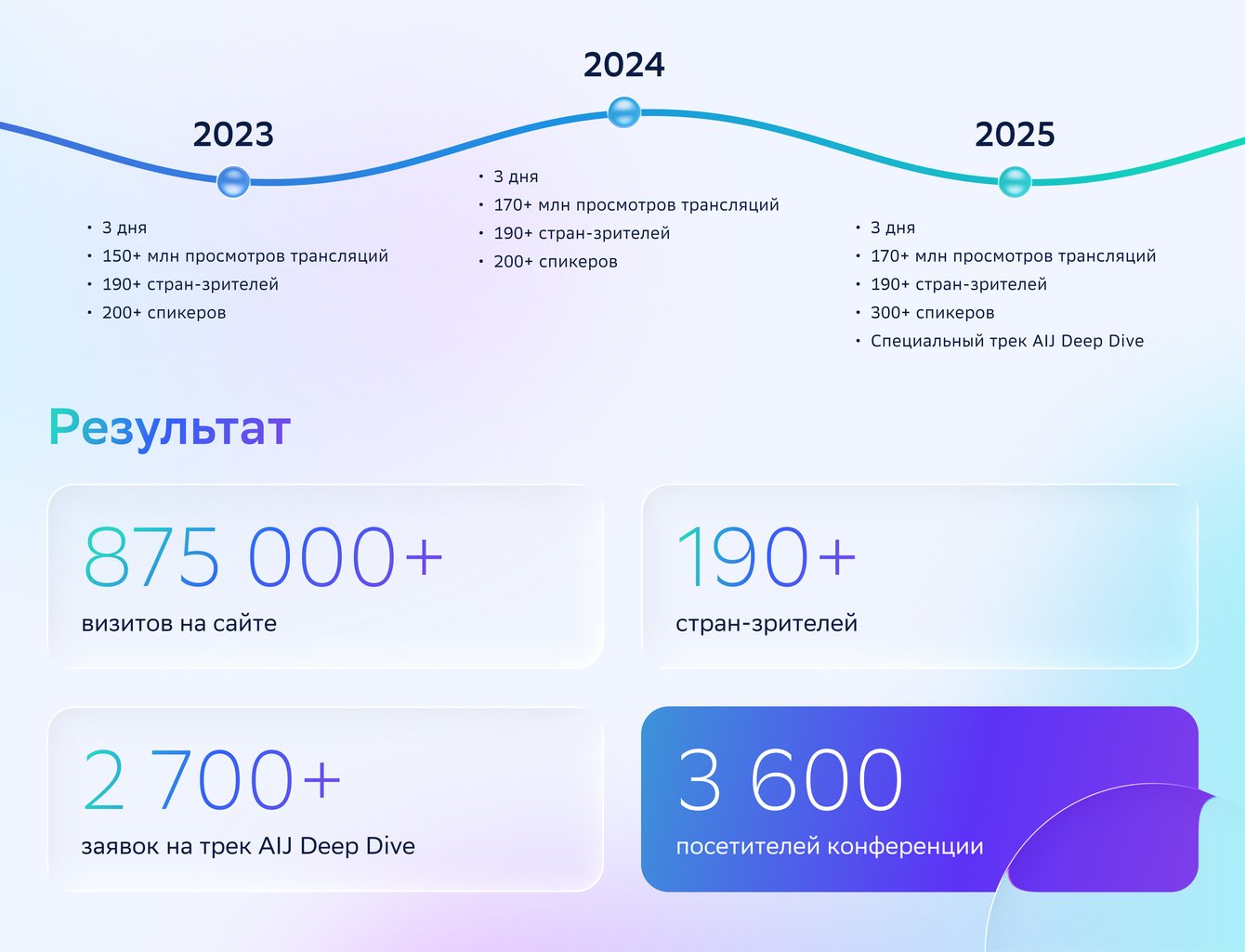 В результате сайт корректно сработал на аудиторию из 190+ стран, участвовавших в трансляции конференции в 2025 году.