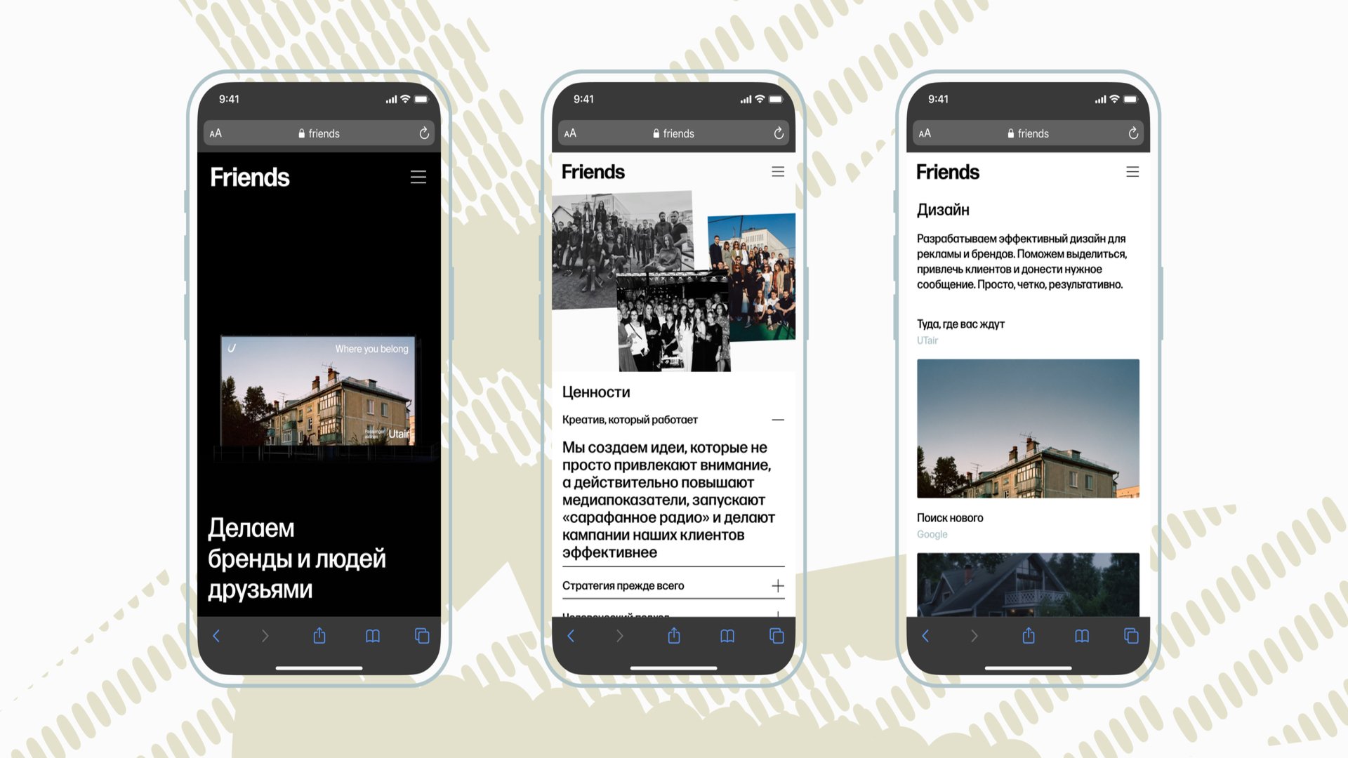 Friends — про рекламу и креатив. Нам было важно не перегрузить сайт, а наоборот — вытащить работу агентства на первый план. Мы сделали ставку на минимализм и чистую композицию.