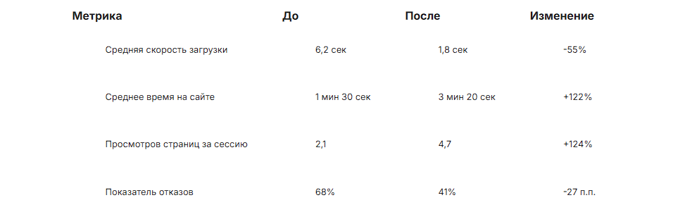 Комментарий: снижение отказов и рост времени на сайте говорят о повышении вовлеченности. Пользователи стали рассматривать больше товаров и дольше задерживаться.