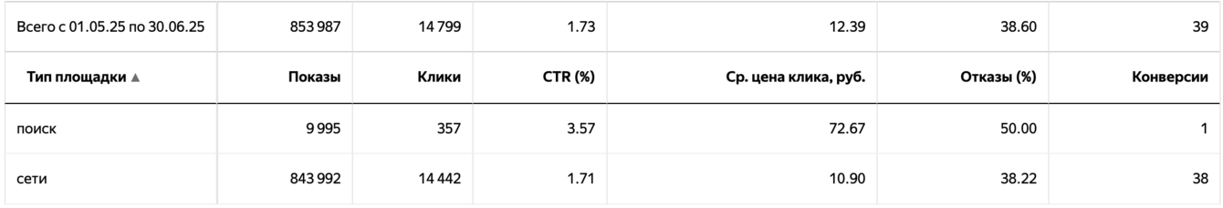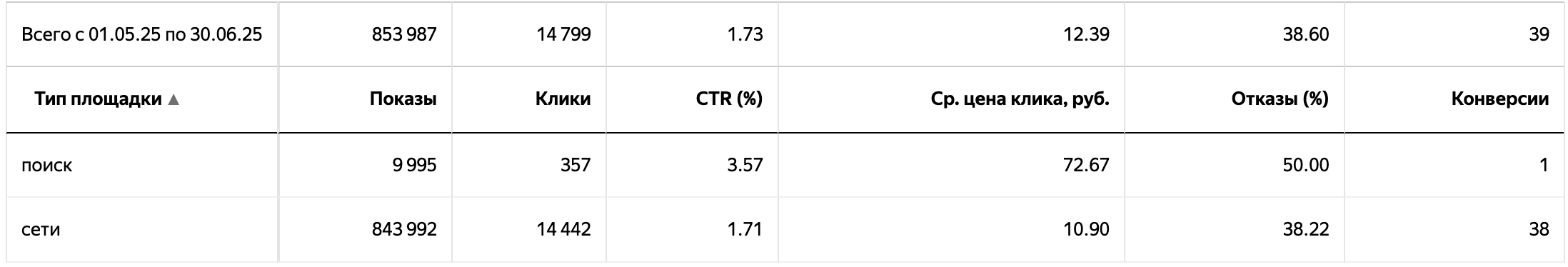По итогам перезапуска стало видно, что основным источником лидов стали сетевые кампании. Уже в мае основной объем обращений пришел из РСЯ, а в июне этот тренд усилился: рекламные сети дали 21 лид из 23. При этом стоимость лида в РСЯ составила 5 296 рублей, что почти в 2 раза ниже, чем на поиске.