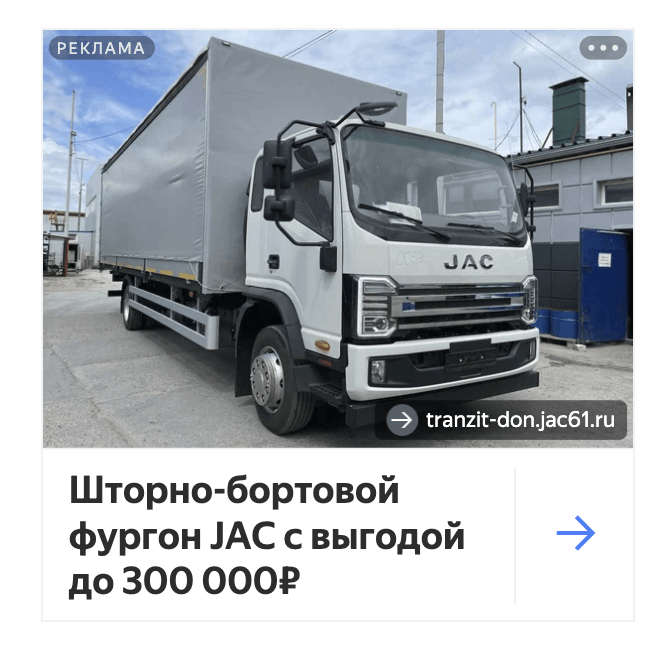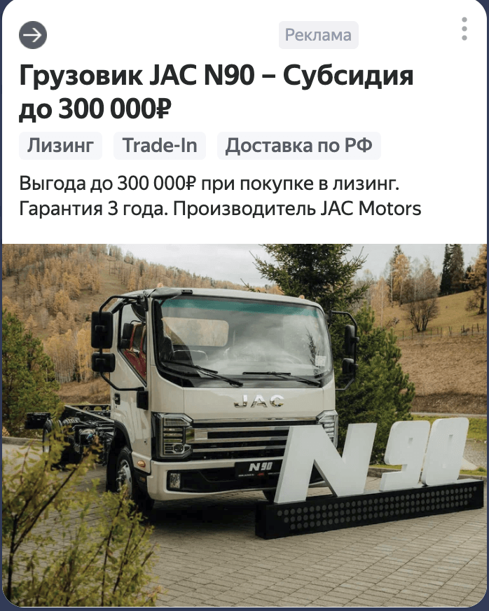 Лучше всего сработала реклама на шторно-бортовой фургон JAC, а наиболее эффективным оказался оффер с акцентом на субсидированный лизинг. Именно сочетание переработанной логики рекламы, квиза и оптимизации кампаний позволило вывести проект на более сильные показатели после весеннего перезапуска.