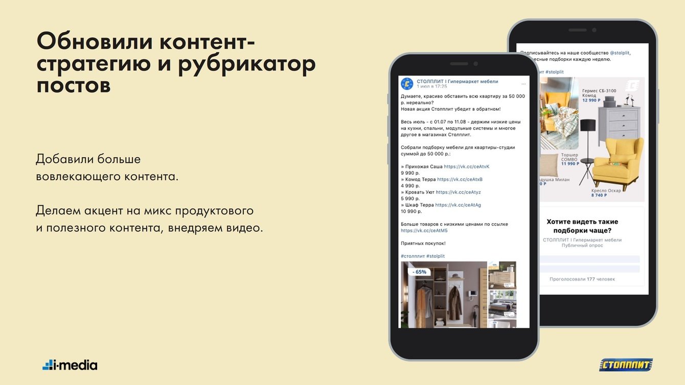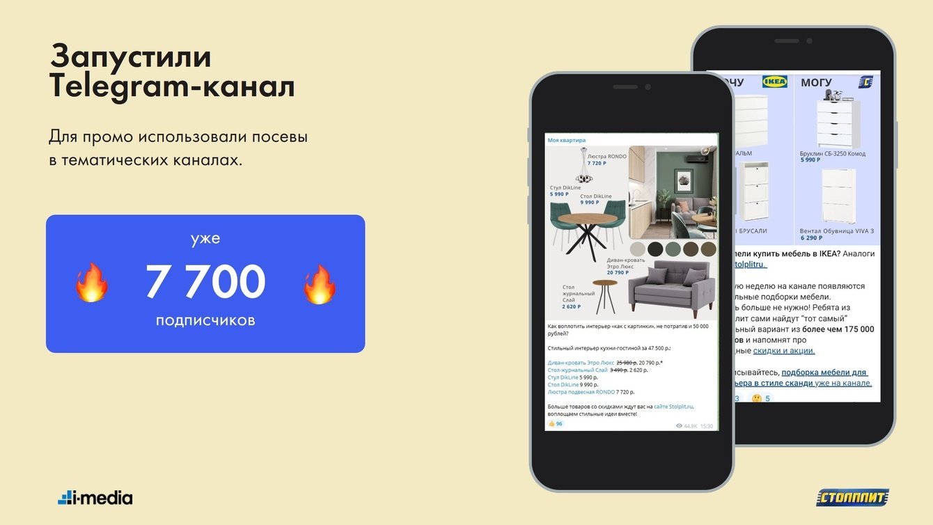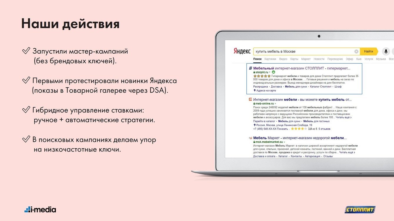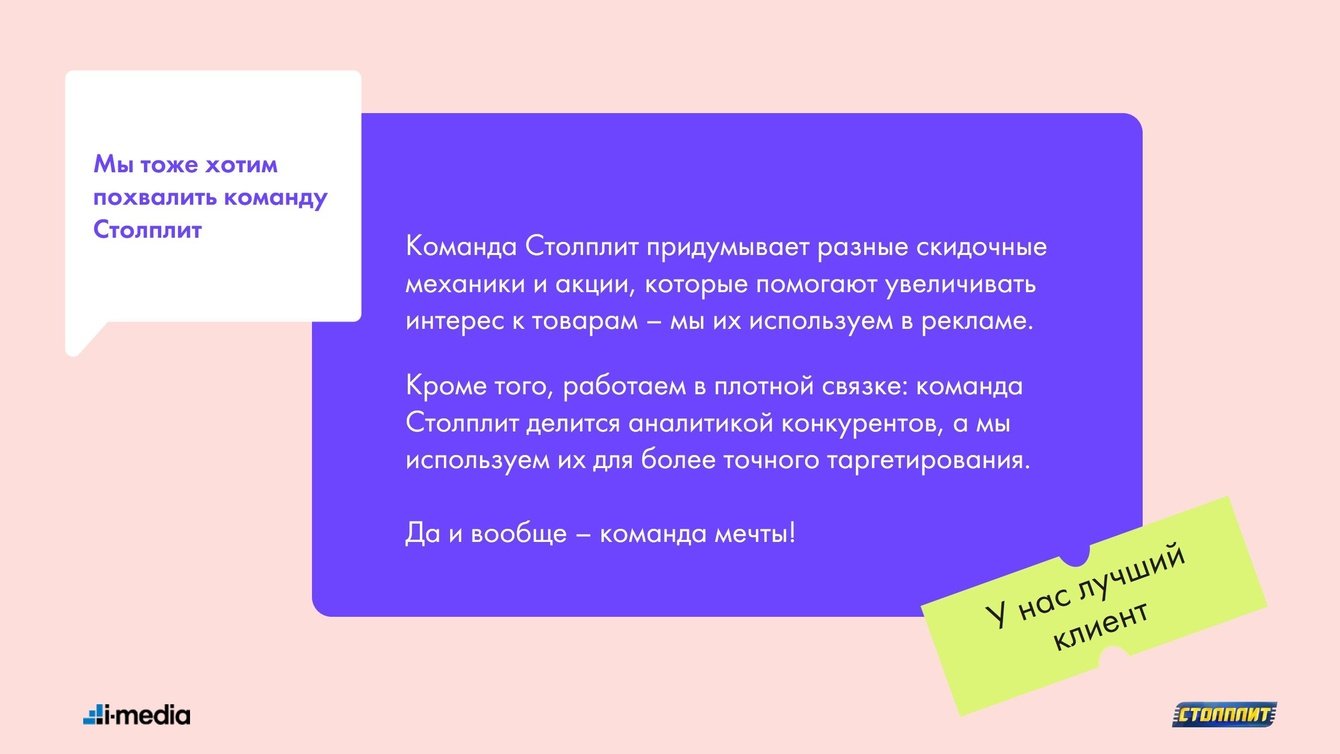 Команда Столплит придумывает разные скидочные механики и акции, которые помогают увеличивать интерес к товарам – мы их используем в рекламе. Кроме того, работаем в плотной связке: команда Столплит делится аналитикой конкурентов, а мы используем их для более точного таргетирования. Да и вообще – команда мечты!