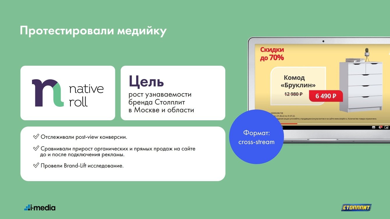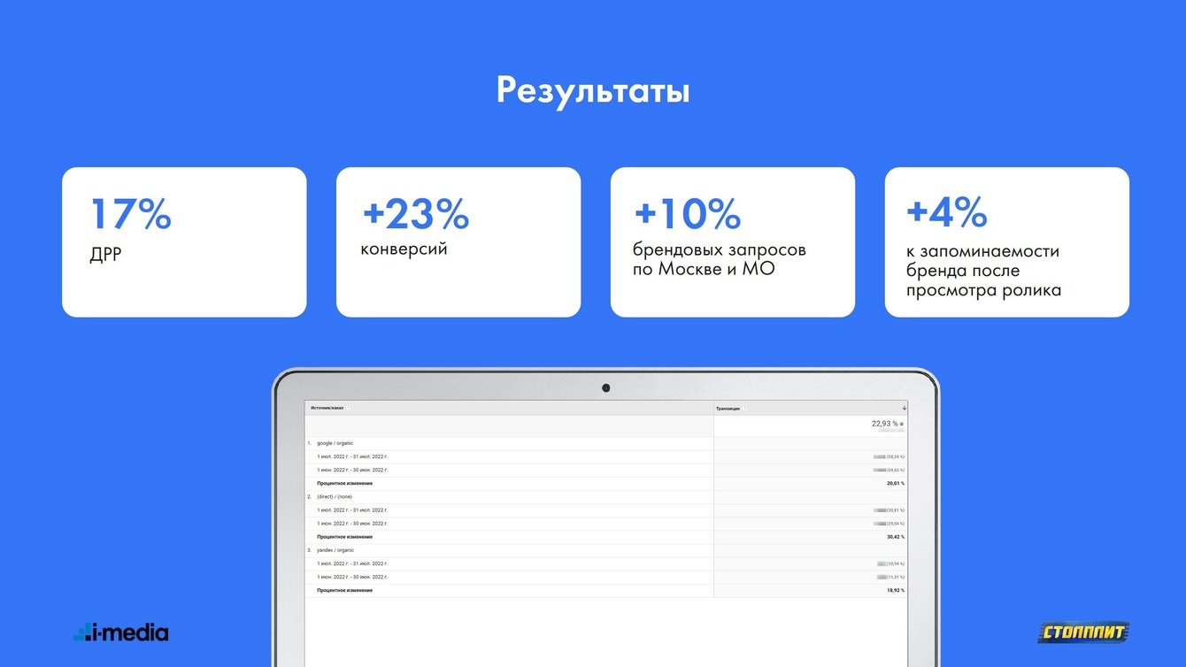 Для роста узнаваемости бренда «Столплит» в Москве и области протестировали медийную рекламу и провели Brand-Lift исследование. Это позволило увеличить конверсии на 23% и снизить ДРР до 17%.