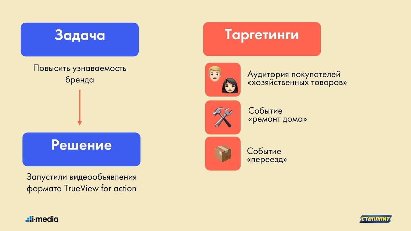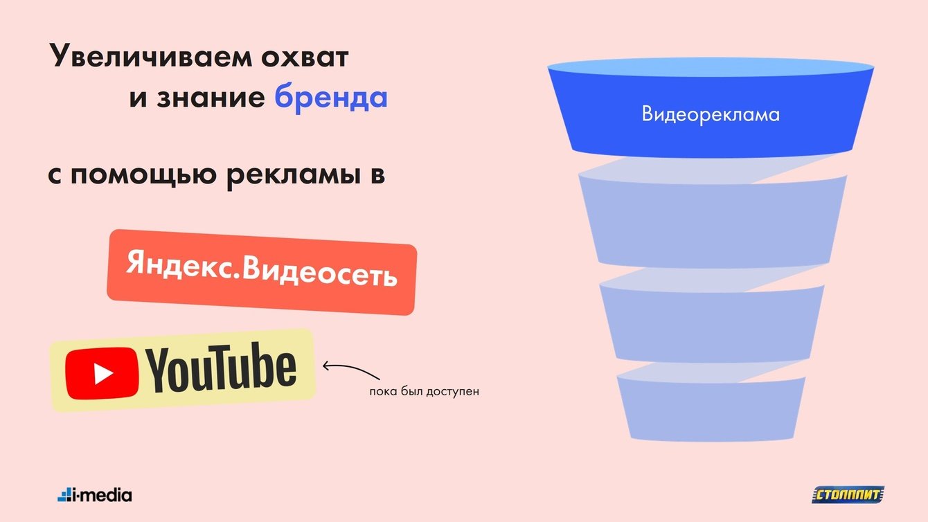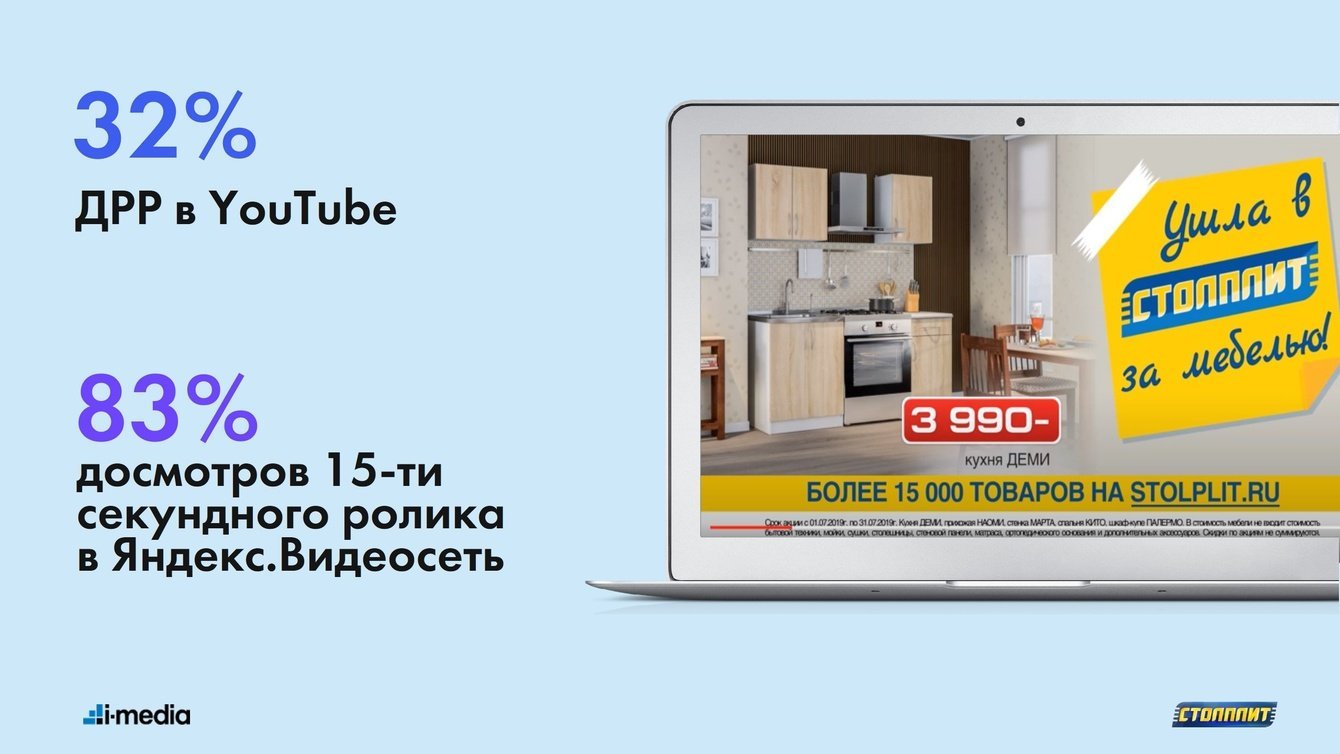 Для укрепления знания о бренде «Столплит» выбрали Яндекс.Видеосеть и YouTube (пока был доступен). Решили запустить видеообъявления формата TrueView for Action и получили ДРР =32% в YouTube. При этом 83% пользователей досмотрели 15-ти секундный ролик в Яндекс.Видеосеть.
