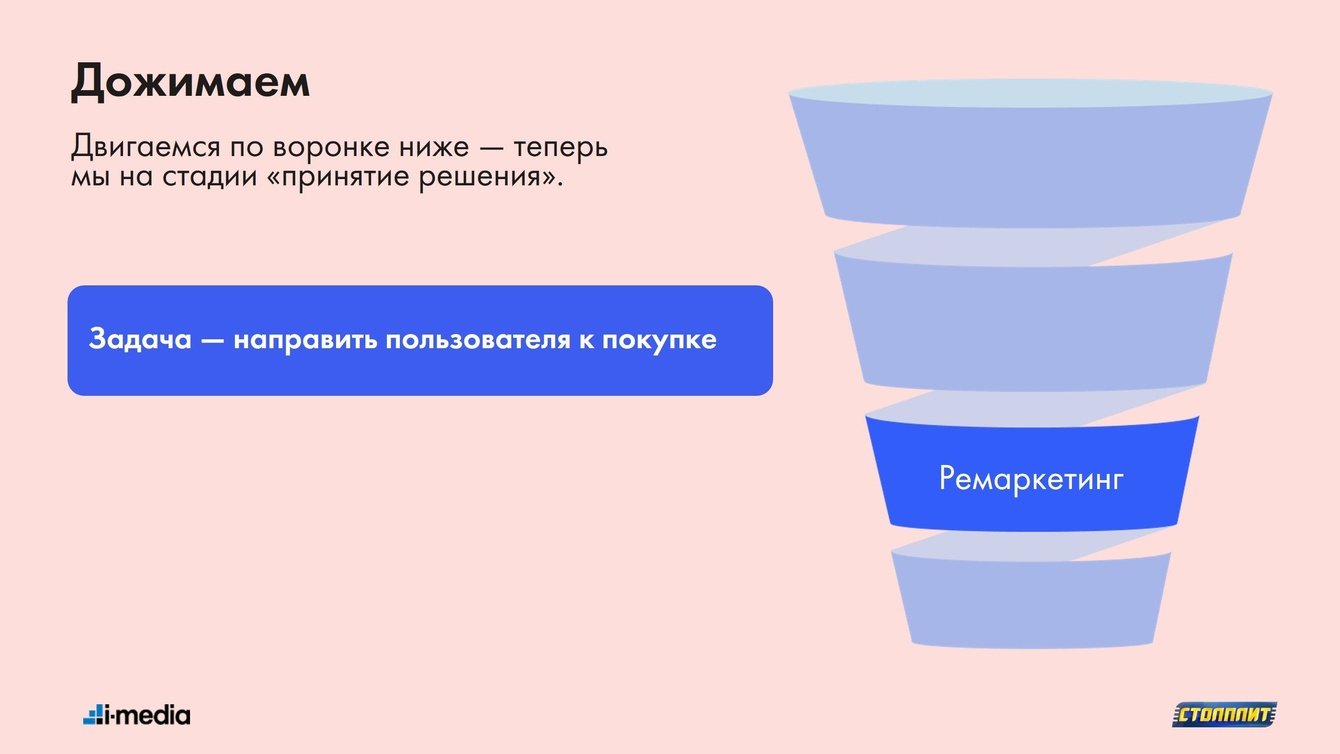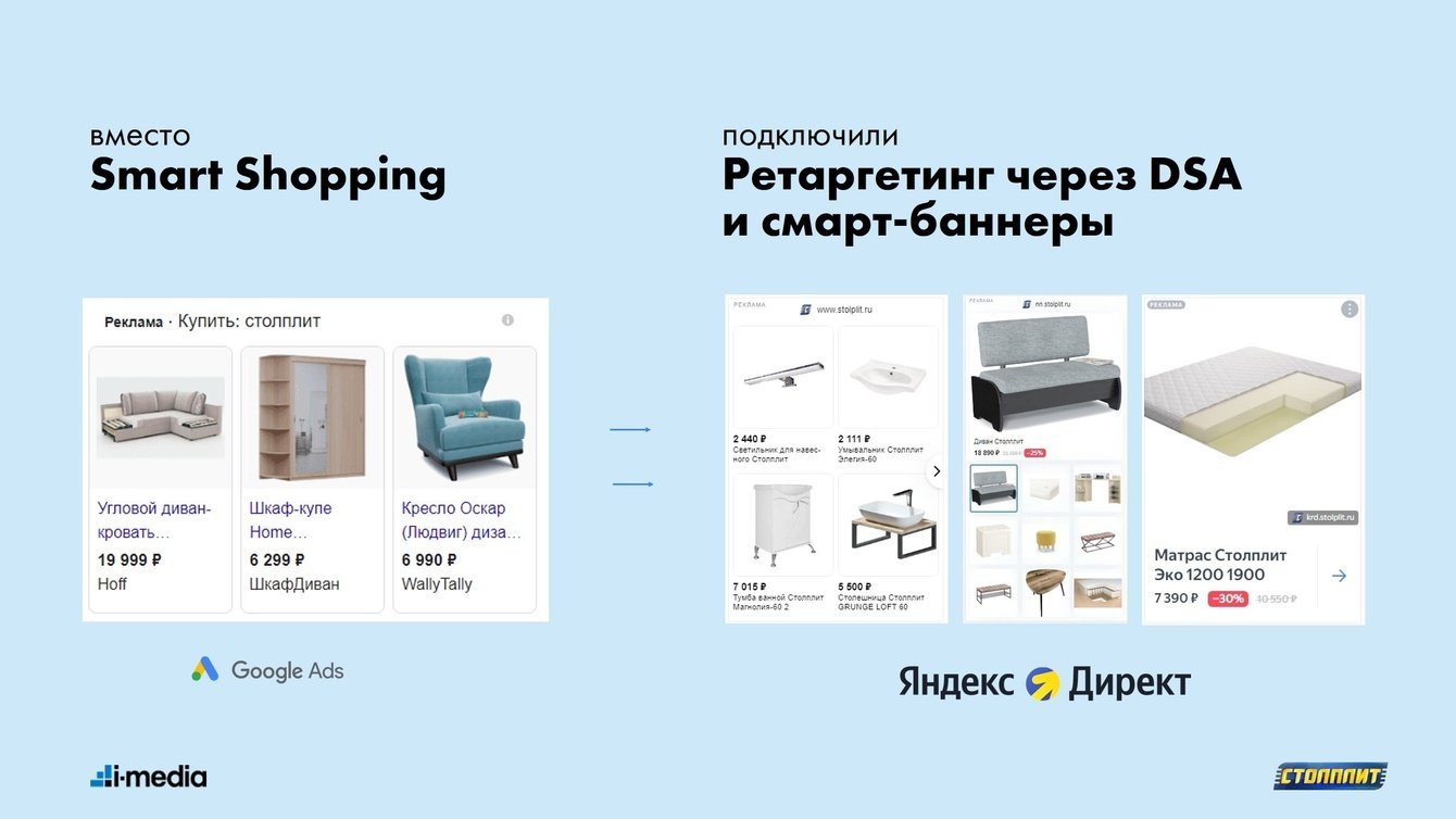 Двигаемся по воронке ниже - теперь мы на стадии «принятие решения». Наша задача - направить пользователя к покупке. В этом нам помог ретаргетинг. Вместо Smart Shopping подключили ретаргетинг через DSA и смарт-баннеры.