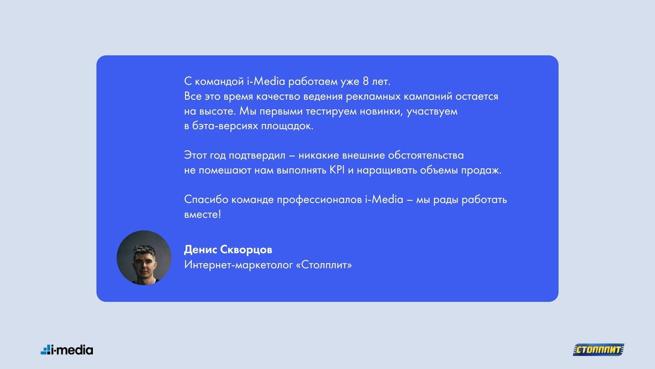 Этот год подтвердил – никакие внешние обстоятельства не помешают нам выполнять KPI и наращивать объемы продаж. Спасибо команде профессионалов i-Media – мы рады работать вместе!