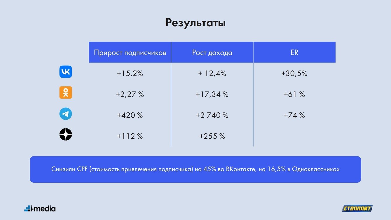 А еще запустили Telegram-канал и набрали 7 700 подписчиков. Во всех соцсетях мы получили прирост подписчиков, ER (вовлеченности) и дохода! А в ВКонтакте и Одноклассниках даже удалось снизить стоимость привлечения подписчика.