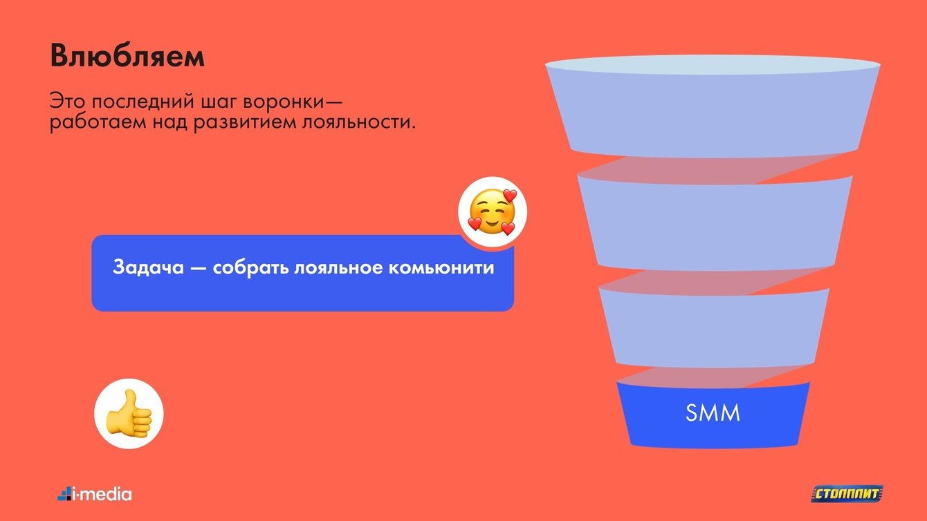 Это последний шаг воронки - работаем над развитием лояльности. Наша задача - собрать лояльное комьюнити.
