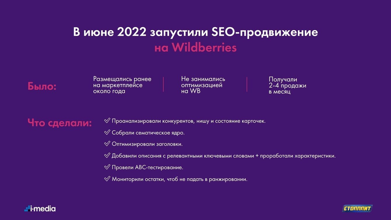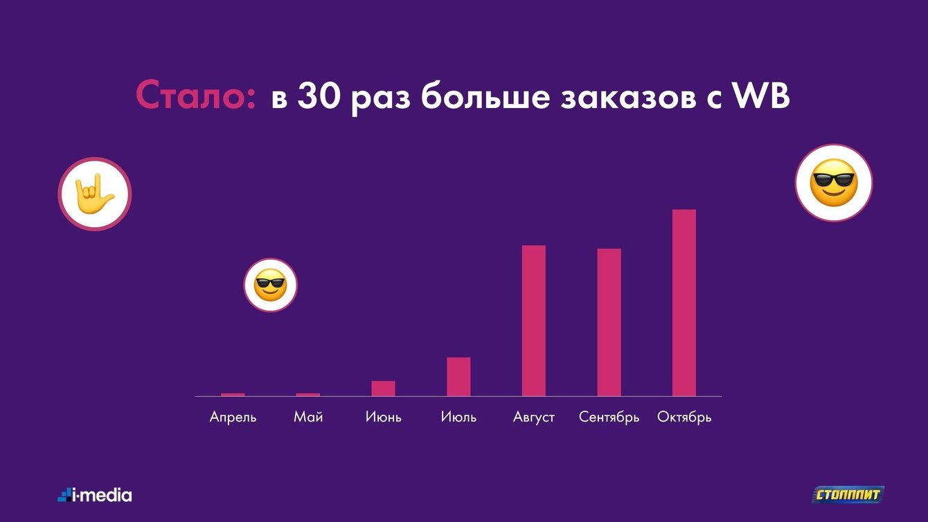 В июне 2022 запустили SEO-продвижение на Wildberries. Ранее клиент уже размещался на маркетплейсе около года, но выходило только 2-4 продажи в месяц. Мы пересобрали семантику, переписали заголовки, добавили описания с ключевыми словами и получили в 30 раз больше заказов с WB!