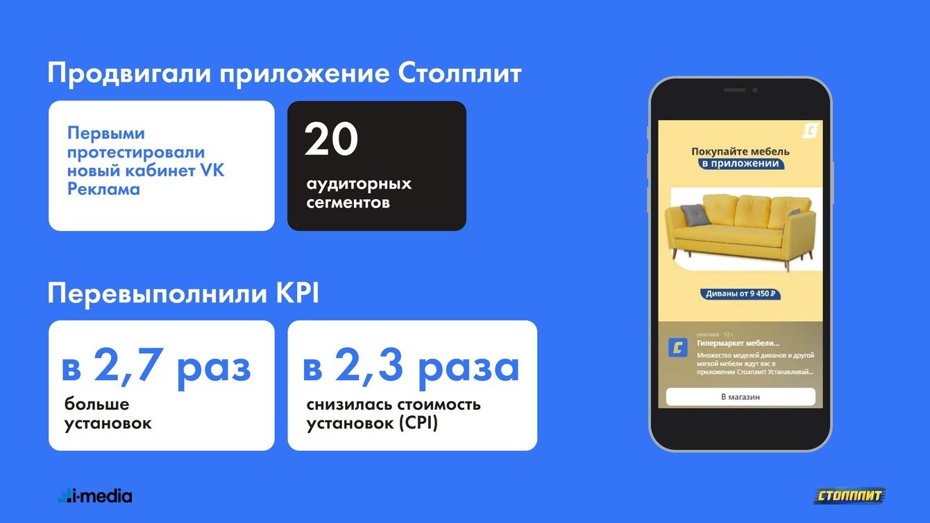 После ухода Facebook нам надо было где-то брать заказы. Поэтому решили в числе первых протестировать кабинет VK.Реклама. Там же настроили продвижение приложения «Столплит». И получили в 2,7 раза больше установок и снизили CPI в 2,3 раза. В итоге, перевыполнили KPI.