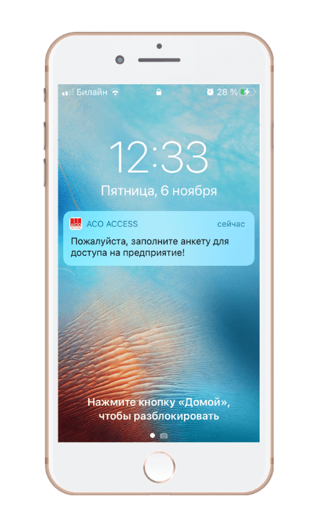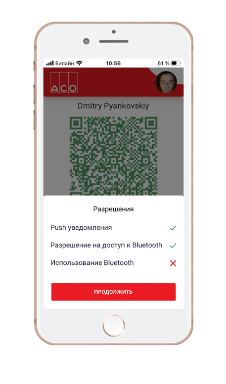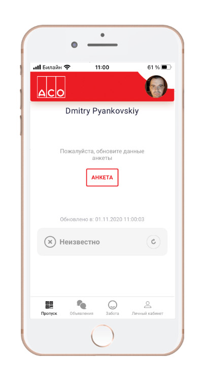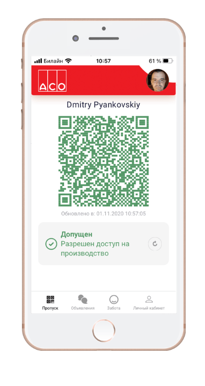● Индивидуальный пропуск сотрудника в мобильном приложении для контроля доступа на предприятие или в цех.