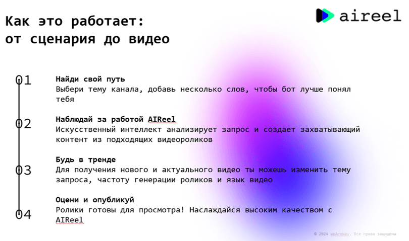 Общая идея проекта заключается в создании интуитивно понятного и использования чат-бота, который будет генерировать видеоматериалы для социальных сетей в соответствии с индивидуальными потребностями пользователей. Процесс генерации видео будет проходить в реальном времени и базироваться на вводимых параметрах.