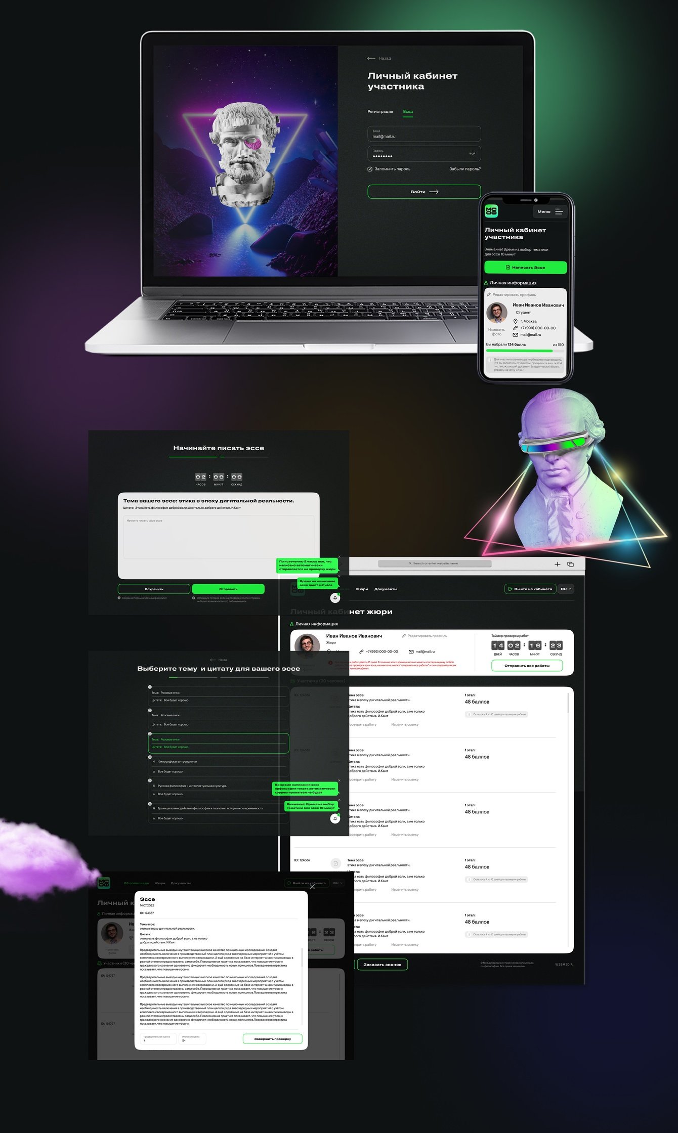 2) личный кабинет жюри — представляет собой список анонимных эссе с разными ID и возможностью выставления баллов;