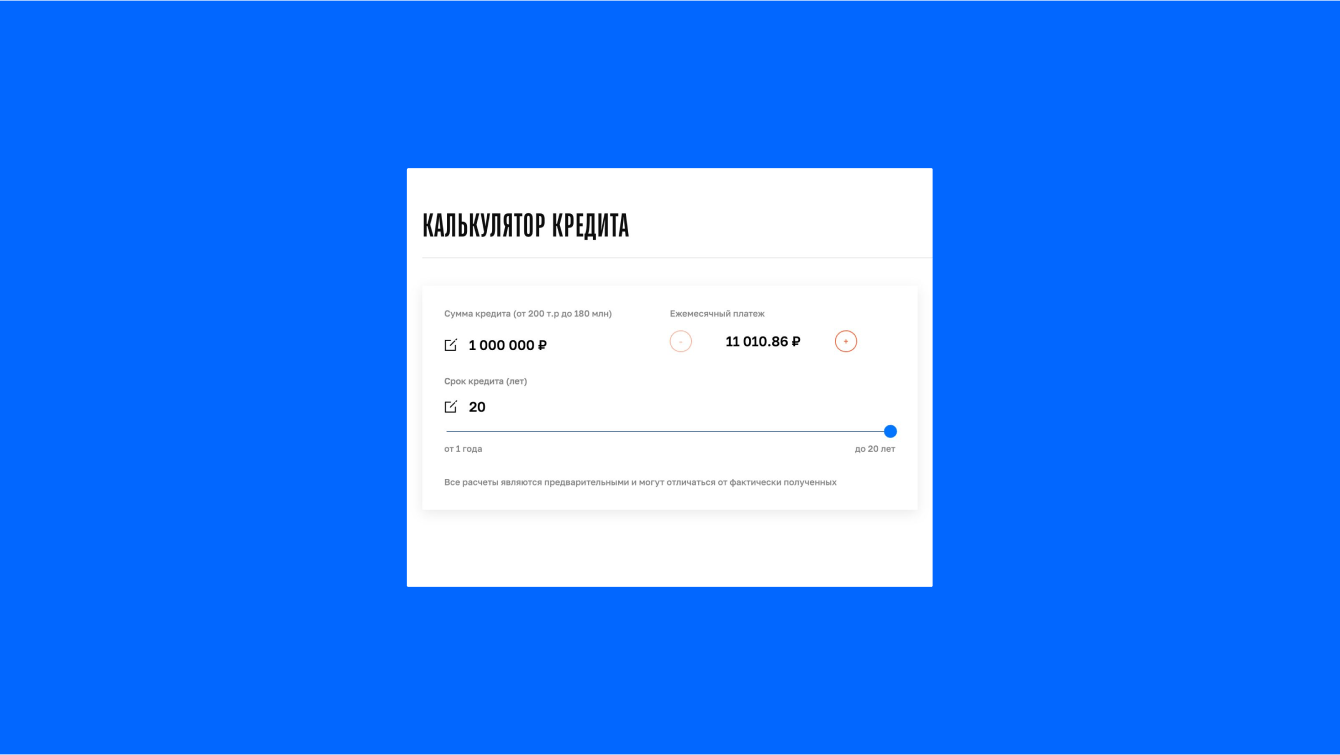 Реализовали калькулятор кредита — один из самых сложных и интересных элементов нового сайта. Самым трудным было интегрировать формулы расчёта платежей из Excel в JavaScript. Мы протестировали несколько библиотек, чтобы найти оптимальное решение, и настроили формулу так, чтобы она корректно работала на сайте.