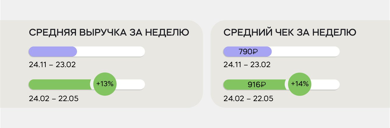 Сравнили два периода (до и после старта продвижения). По итогам средняя выручка за неделю выросла на 13%, средний чек — на 14%.