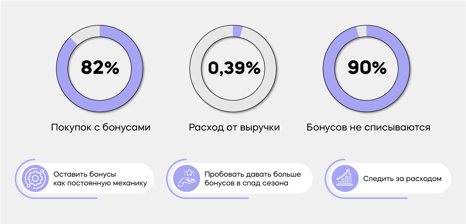 Наличие механики «Бонусы продавца» на карточке повышает лояльность — клиенты охотнее оформляют заказ, чтобы получить бонусные баллы. Продажи растут, при этом 90% бонусов покупатели не списывают, когда оформляют следующий заказ. Это значит, что расходы на механику остаются минимальными, хотя она дает заметный буст продаж. Решение оказалось выигрышным.
