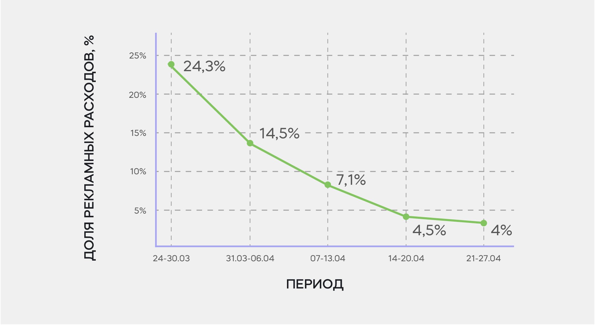 Мы помогли клиенту снизить долю рекламных расходов до целевого значения (4%) и увеличить выручку (средняя выручка за неделю выросла на 13%, средний чек — на 14%), но не решили вторую задачу, которая состояла в кратном росте продаж. И этому есть объяснение.