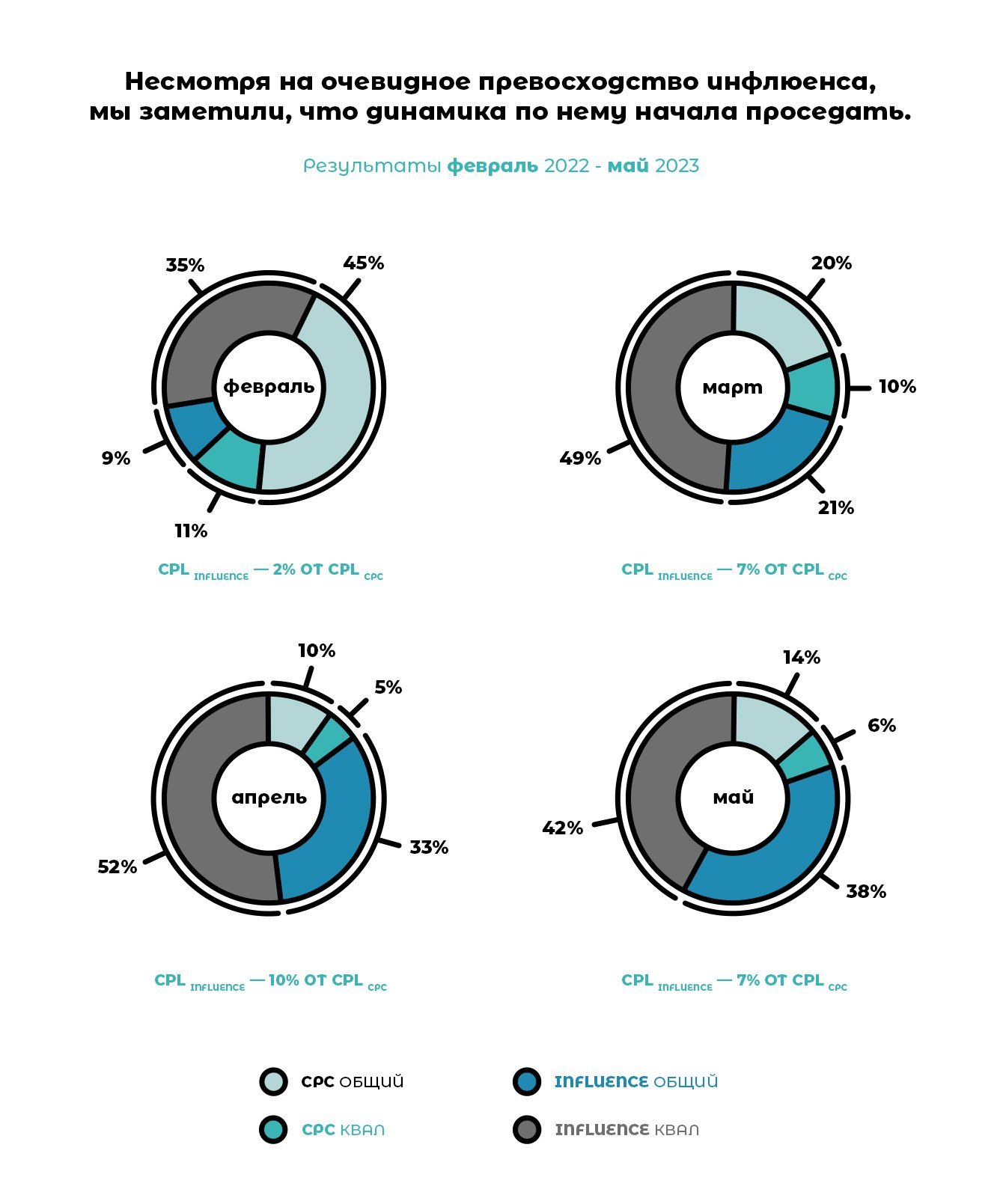 Инфлюенс-маркетинг зарекомендовал себя как канал, способный принести внушительный объём дешевых качественных лидов и трафика за короткое время. Важный вывод – прогнозирование выгорания аудитории.