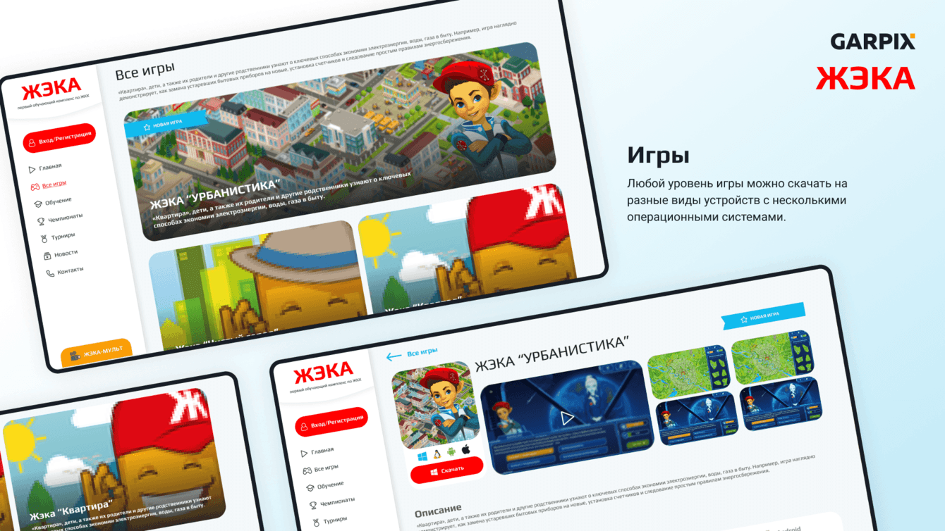 - Добавили интерактивную карту, на которой расположены объекты из разных уровней игр «ЖЭКА». При наведении на них курсора появляется описание и иллюстрации этого уровня игры с предложением скачать его на любое устройство.