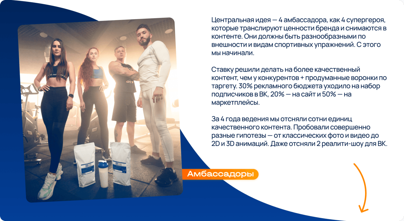 С ребятами мы прошли долгий путь — от никому неизвестного протеина до лидера рынка. Скажу честно, я человек старой закалки и не очень верил в SMM, но показанный результат смог меня переубедить. Но не стоит отрицать то, что наш продукт высочайшего качества, и в связке с правильными действиями в интернете это даёт эффект синергии.