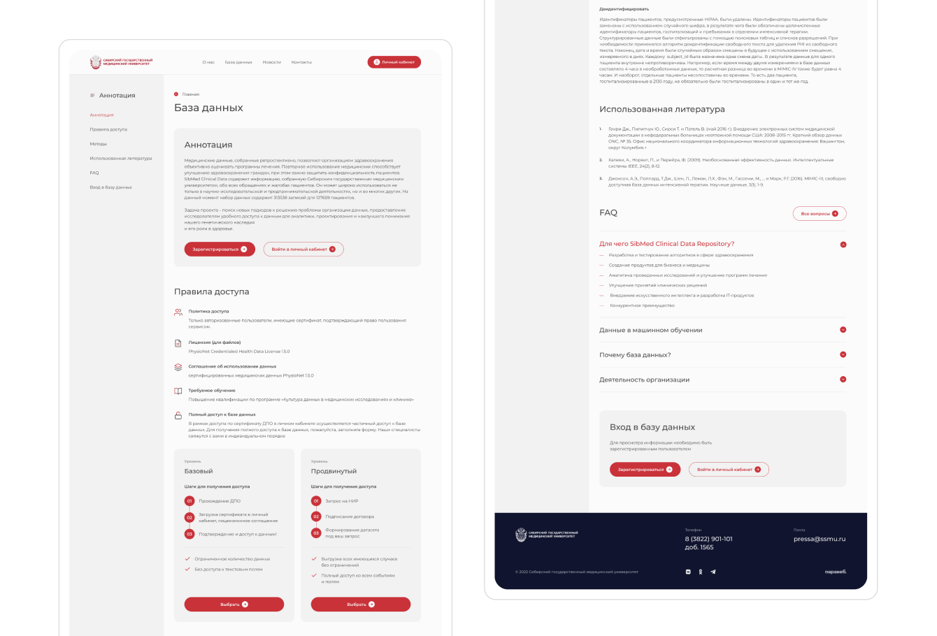 При разработке дизайна для данного проекта мы руководствовались дизайн-системой и брендбуком СибГМУ, реализованными нами ранее. Они помогли создать платформу в единой стилистике с остальными сайтами университета.