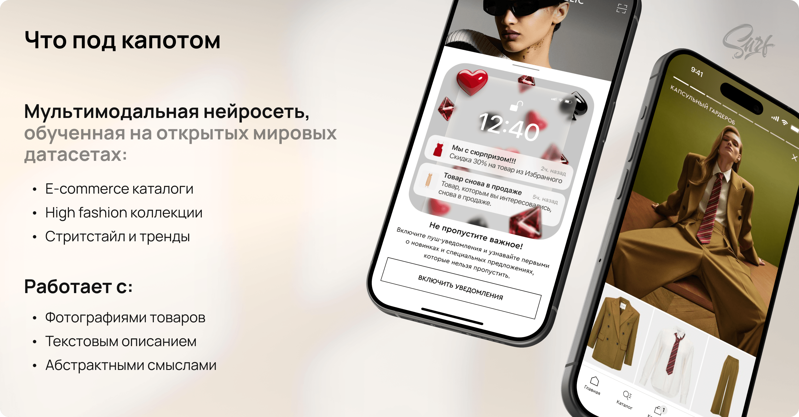 1. Рекомендательную систему. В течение сессии собирает fashion-профиль покупателя (просмотры, корзина, отложенные), находит похожих по вкусу покупателей и подбирает готовые луки — не случайные товары, а стилистически связанные образы.
