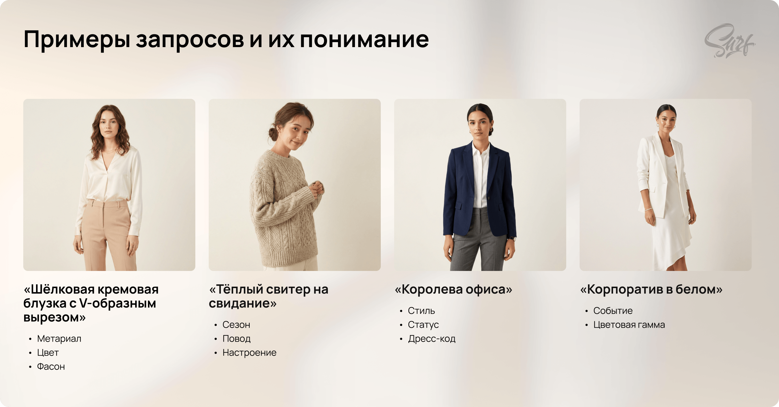 Обычный fashion-поиск не понимает, как люди на самом деле ищут одежду. Покупательницы вводят не только названия вещей, но и живые запросы: «костюм для уютной осени», «деловой casual», «платье для вечеринки». Стандартный поиск с этим не справляется. Он ищет по точным словам из карточки товара и не понимает ни стиль, ни настроение, ни контекст покупки.