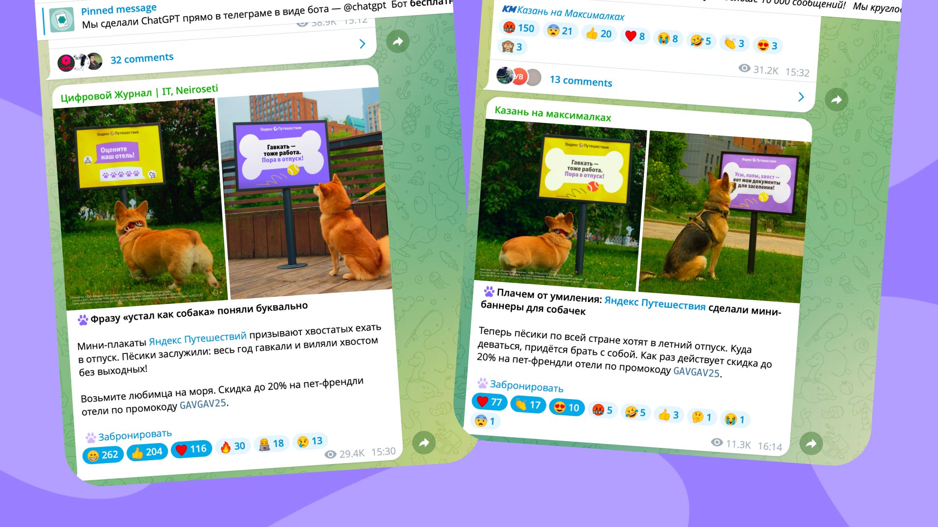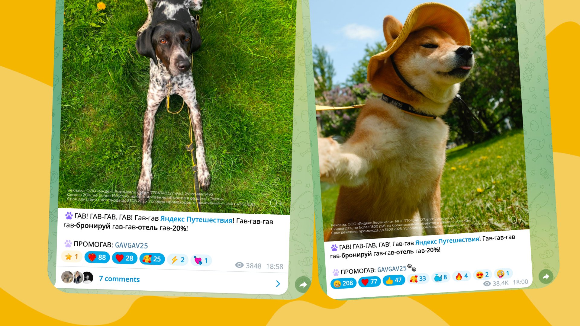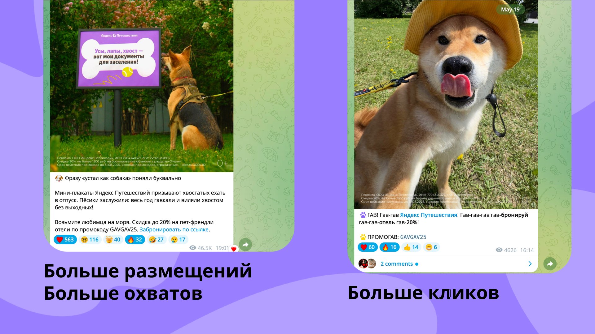 Рекламная кампания «Гав Гав» — моя любимая в 2025 году. Поездки с собаками должны быть комфортными, а Яндекс Путешествия помогут с этим. Мы довольны результатами кампании.