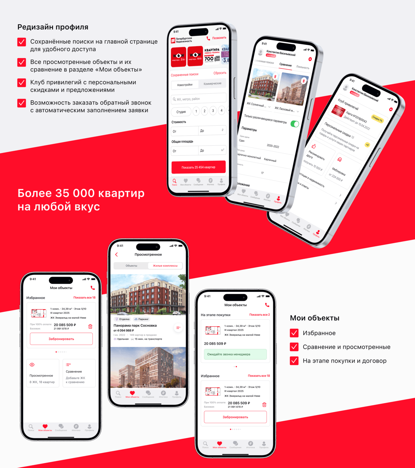 Мобильное приложение «Петербургская Недвижимость» – это доступ к 50 000+ объектам жилой и коммерческой недвижимости от крупнейших застройщиков. В приложении клиенты могут самостоятельно искать и бронировать квартиры, получать онлайн-поддержку.