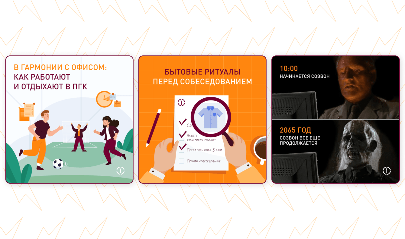 Айдентику бренда мы добавляли в каждый визуал, но не акцентировали на ней внимание. Также обновили дизайн маскотов — Первого и Единички. Они иногда появлялись в коммуникации, играя роль сотрудников ПГК.