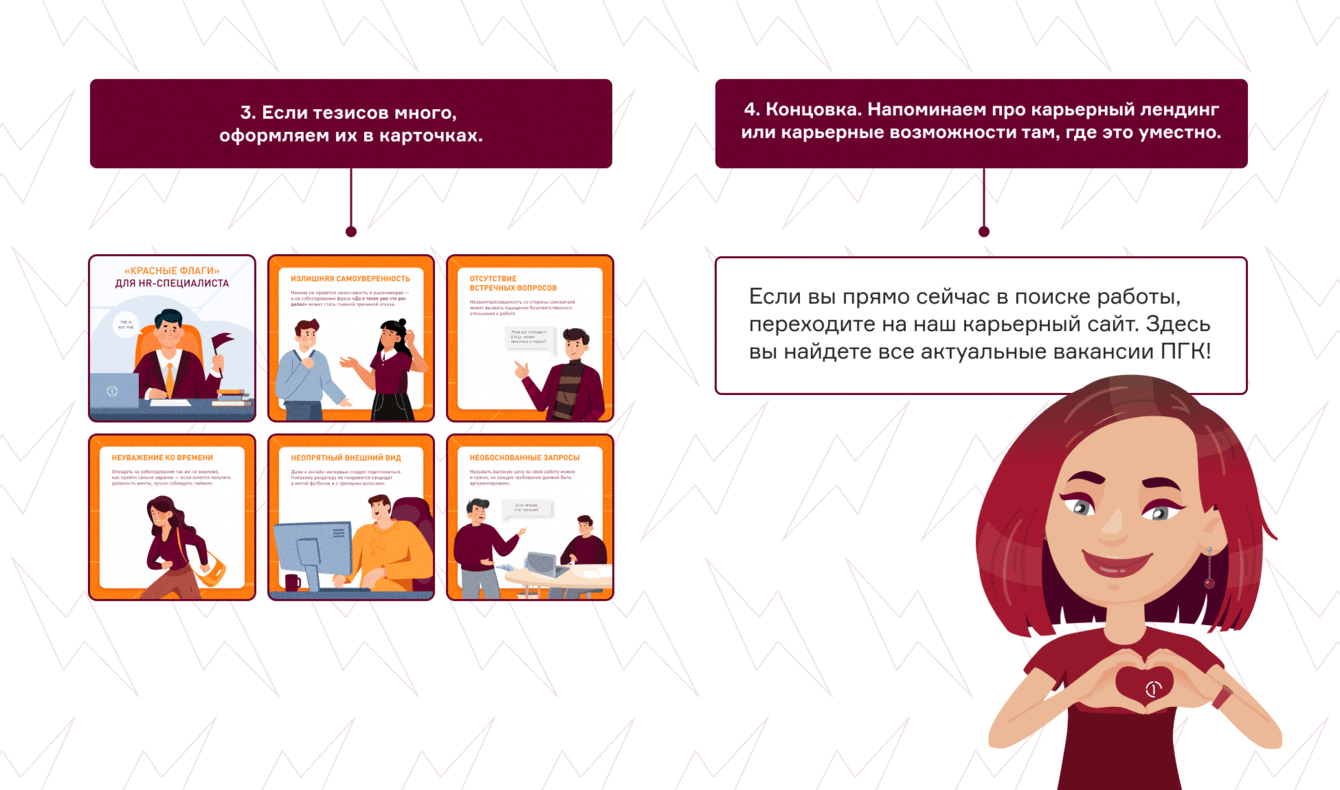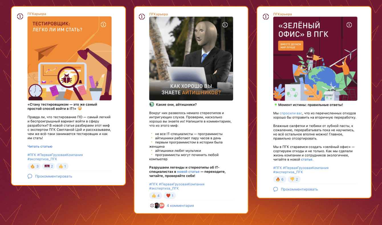 Для каждой публикации составляли подробный план и запрашивали фактуру от клиента. Поэтому раскрытие тем получалось максимально глубоким — в нашей практике ни один работодатель до ПГК не рассказывал о карьере и процессах в своей компании настолько открыто и честно.