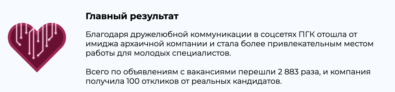 ПГК — хедлайнер в сфере ж/д грузоперевозок. А еще работодатель, который задает тренды и по-настоящему заботится о сотрудниках. Чтобы это показать, мы отстроились от конкурентов через темы контента и их подачу — регулярно раскрывали преимущества работы и карьерные возможности в ПГК, высокую экспертизу компании в логистике и HR.