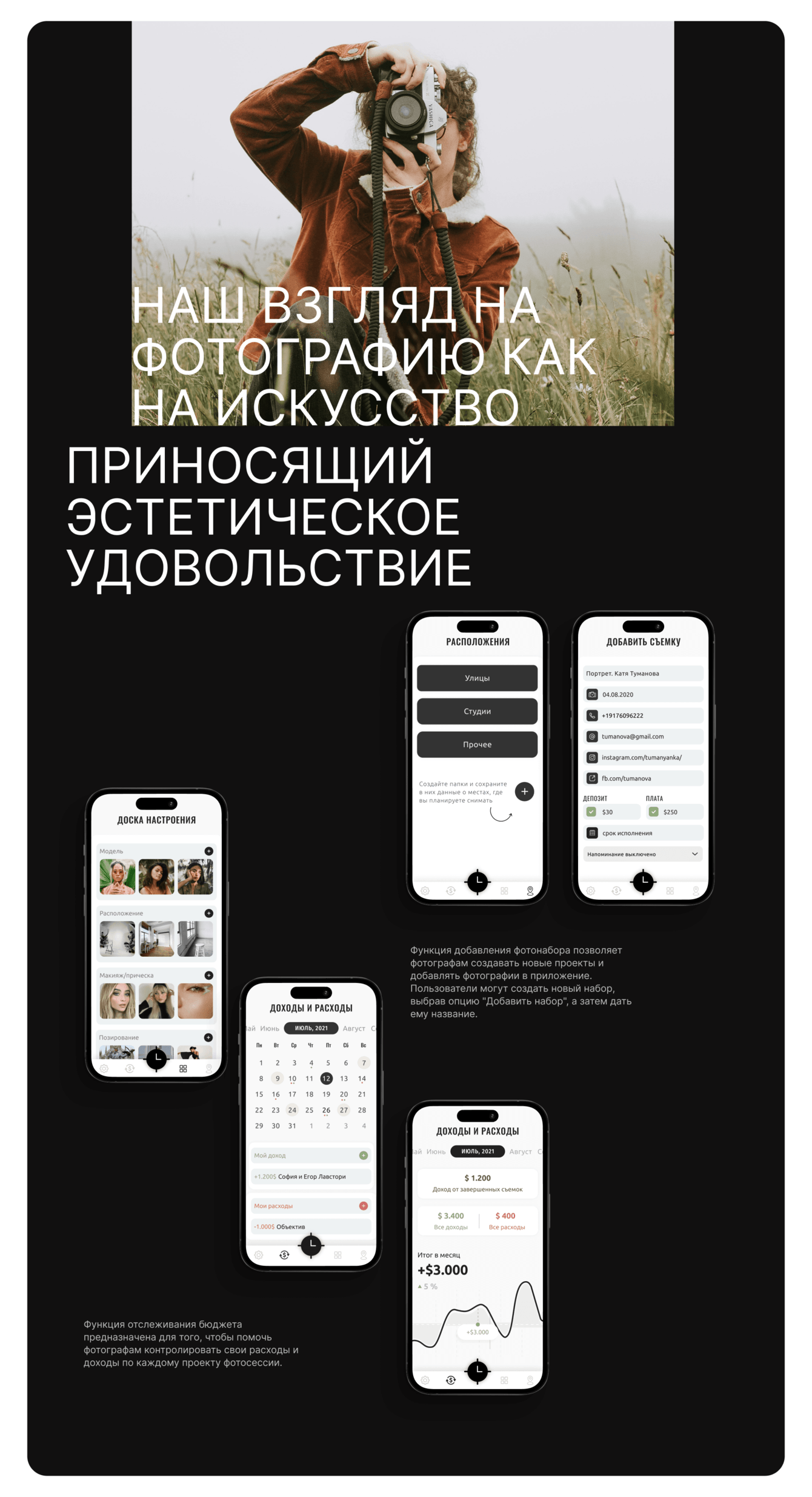 Мы получили запрос от клиента на разработку мобильного приложения для фотографов, которое позволит им управлять своей работой более эффективно. Основные функции, которые клиент хочет включить в приложение, включают возможность добавления пометок о местоположении фотосессии, подбора образов, записи на прием и ведения учета прибыли. Эти функции позволят фотографам легче организовывать свою работу, управлять расписанием и финансами, что в конечном итоге повысит их профессиональную эффективность.