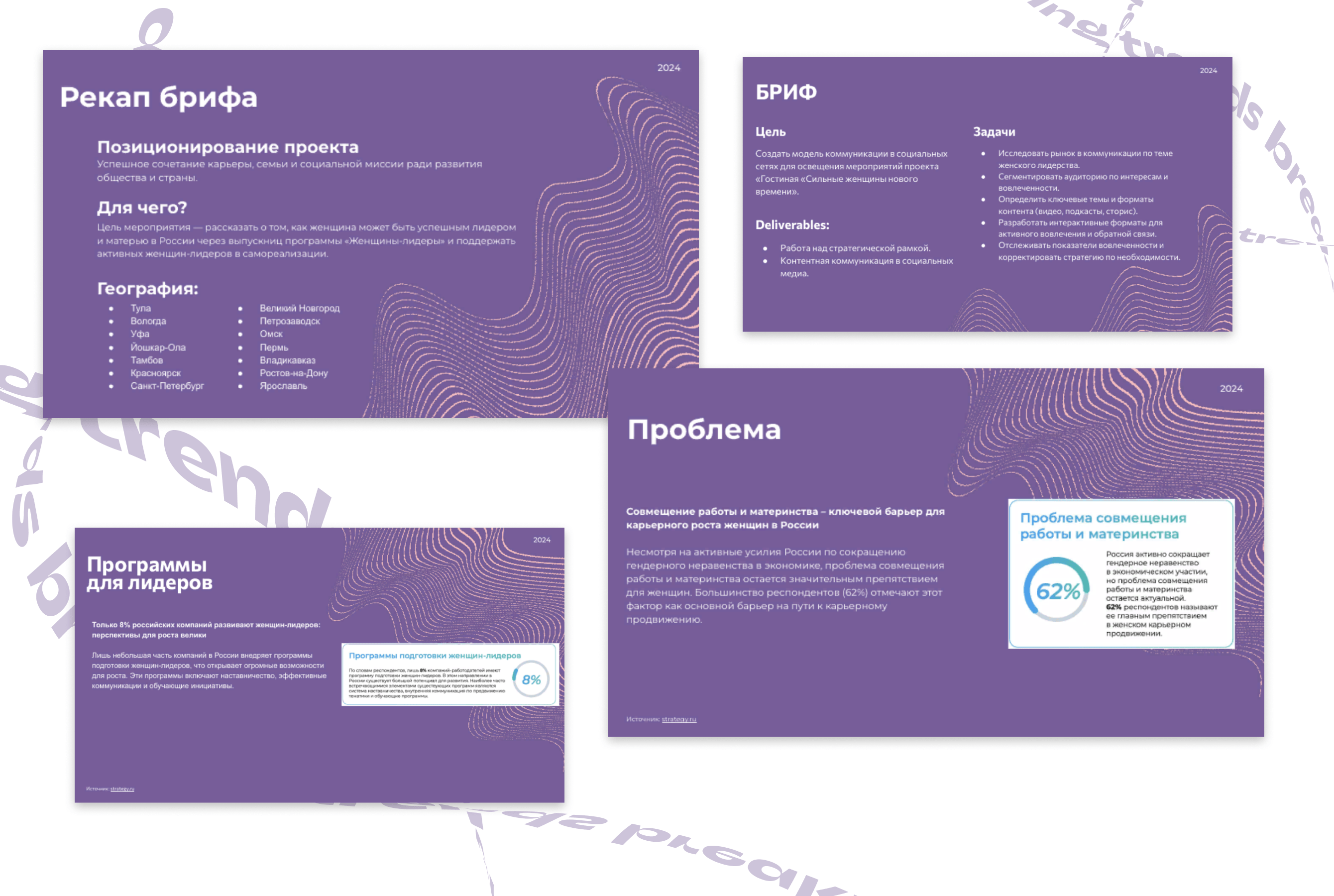 Цель: сформировать через узнаваемый проект в целевых регионах устойчивое положительное восприятие женского лидерства через демонстрацию реальных успешных кейсов и создание сообщества вокруг этой тематики.