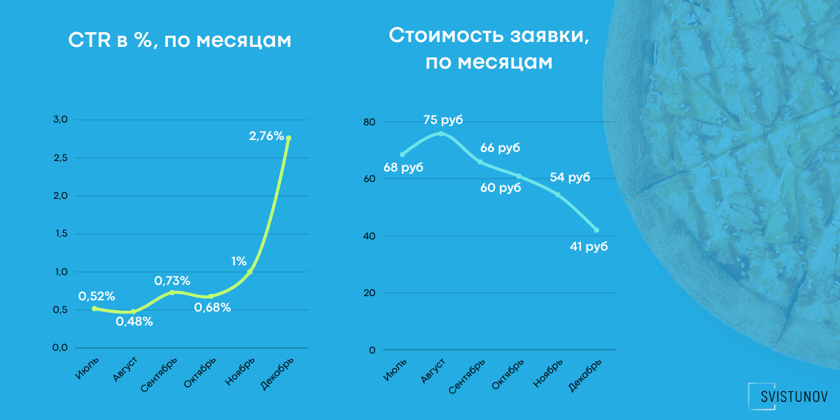 Летом, когда традиционно доставка еды падает в спросе, мы показали рост заказов. Это значит, что системная работа с контекстной рекламой и креативами перекрывает сезонность даже в доставке пиццы.