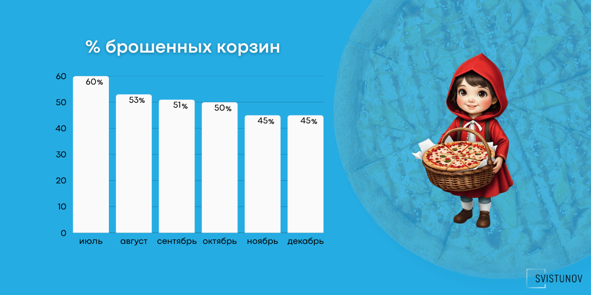Конверсия в первые месяцы составила 6-9%, что укладывалось в ожидаемый интервал 5-15%. Мы обратили внимание на еще один важный для отрасли показатель - процент брошенных корзин. На второй неделе из 31 корзины только 19 перешли в заказ.