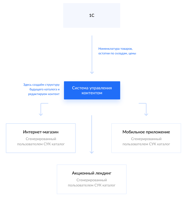 PIM-система – единая система хранения и обмена данными с 1С и другими системами (сайтами, мобильными приложениями, лендингами и т.д.). Она позволяет управлять, изменять и удалять любой контент, который подтягивается в СУК из 1С в одном интерфейсе.