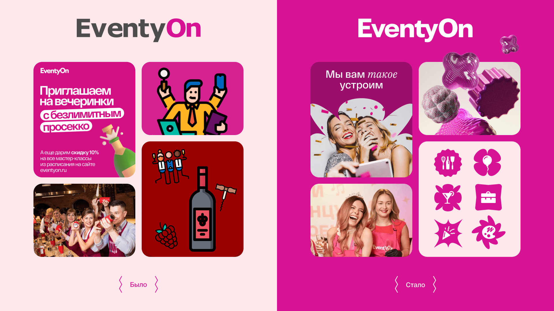 У бренда было множество направлений бизнеса и форматов мероприятий, но каждое направление имело разный визуальный стиль, поэтому не отражало и размывало образ EventyOn.