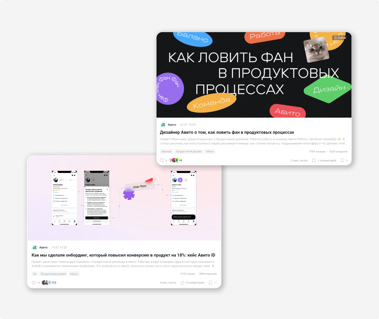 После согласования с автором текста материал публикуют на какой-то из площадок. Вот несколько примеров текстов от дизайнеров Авито, которые мы редактировали: