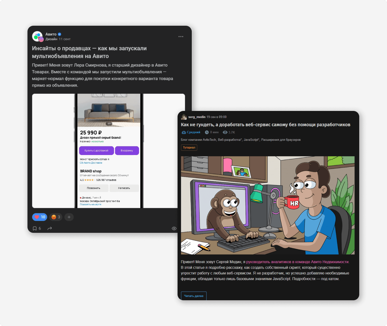 Примеры статей, которые мы написали по интервью с дизайнером и аналитиком Авито: