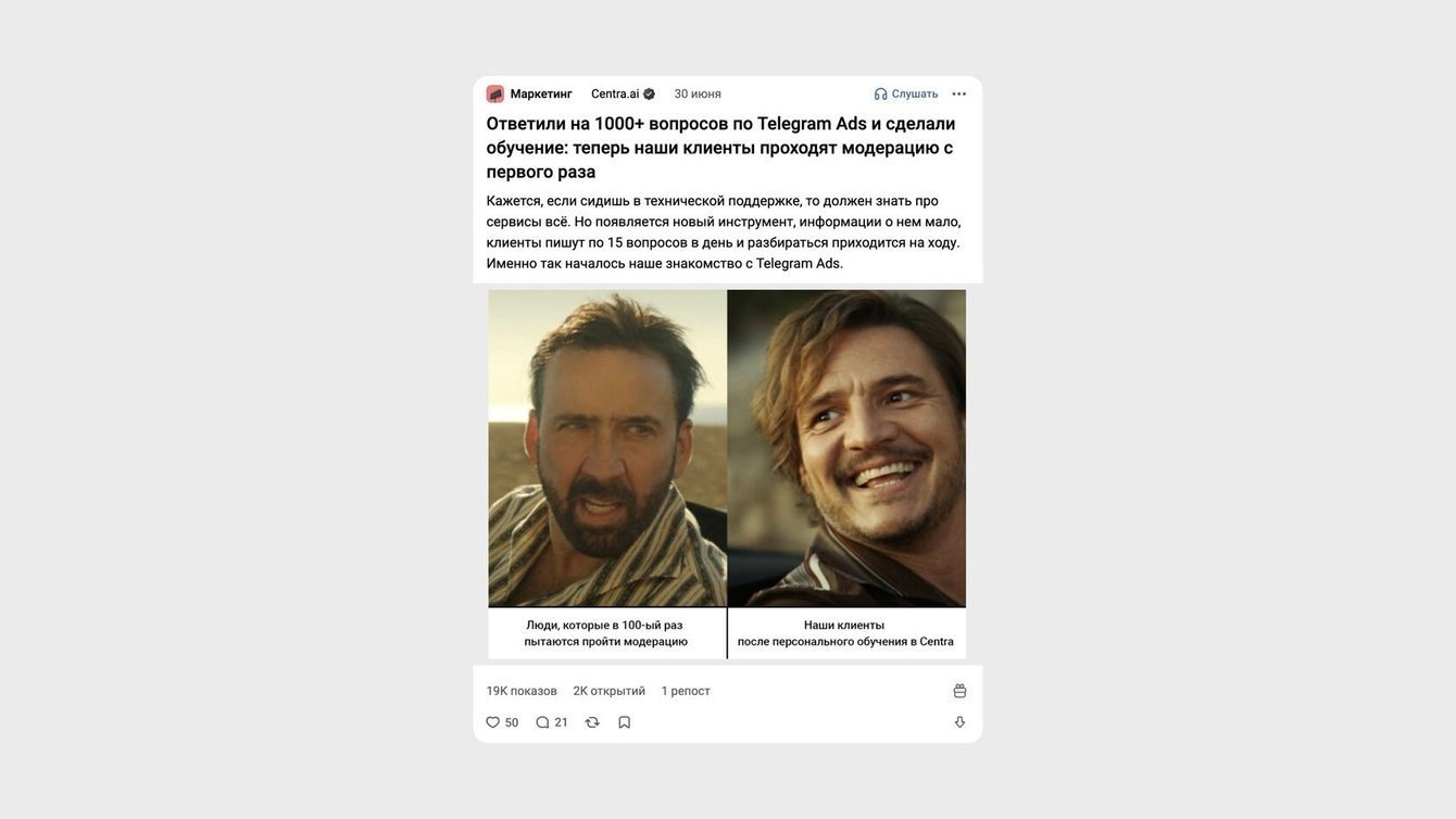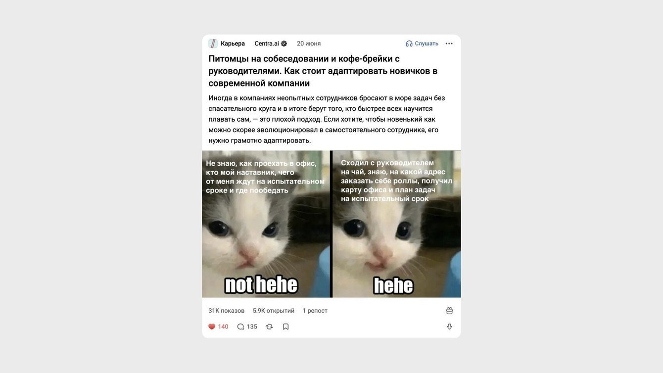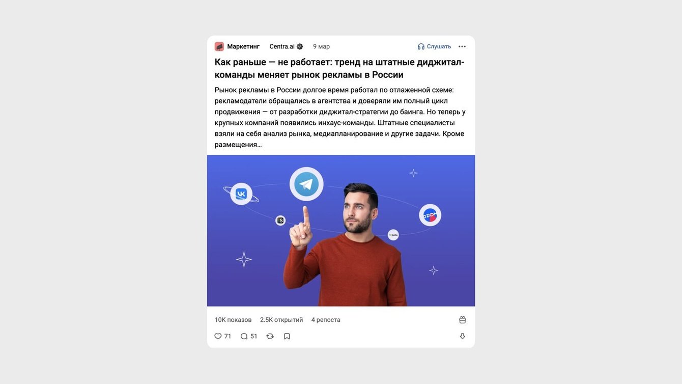 Работу по верстке тоже взяли на себя — готовый материал на vc.ru выкладывает редактор, ответственный за проект. Чтобы статьи получали больше просмотров, день публикации подстраиваем под эксперта — так сотрудник Centra может оперативно отвечать на вопросы читателей.