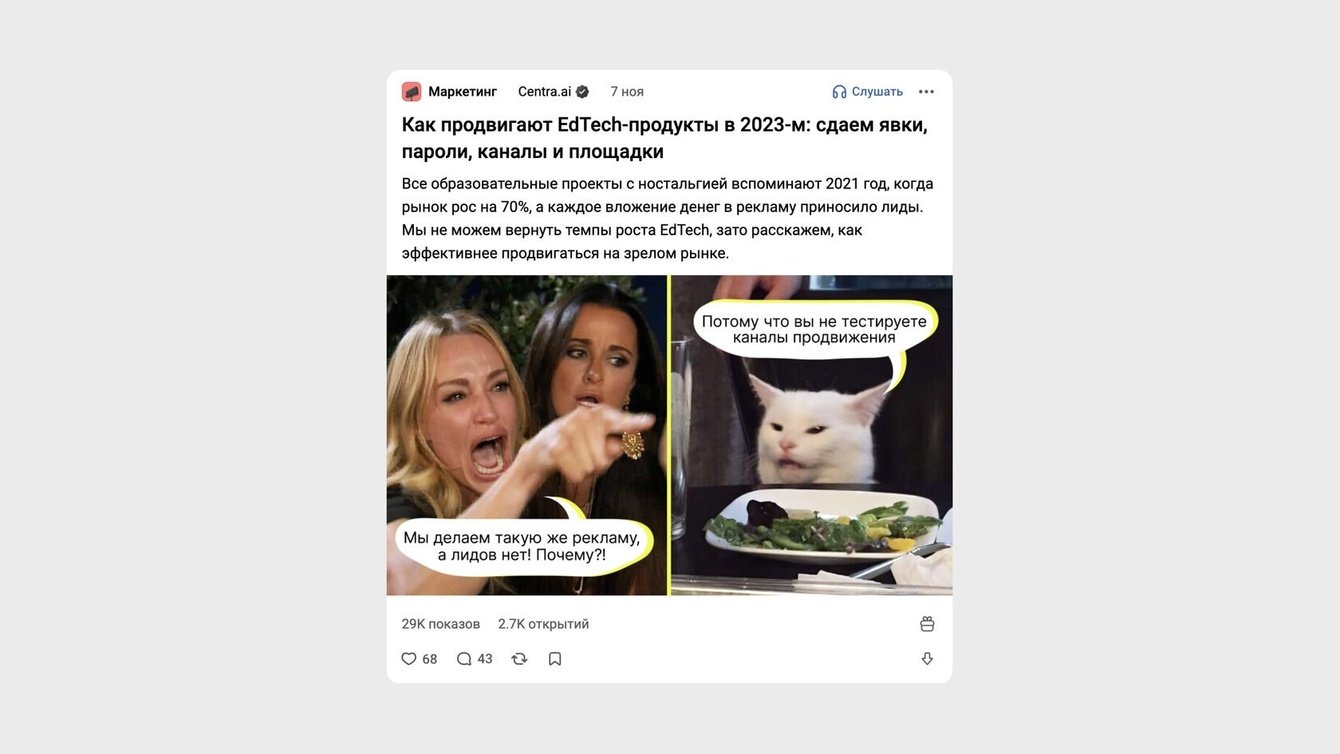 Чтобы сделать обложку к статье про EdTech-продукты, использовали нейросети — сделали изображение четче. В комментариях даже отметили, что в первый раз видят этот мем в таком качестве