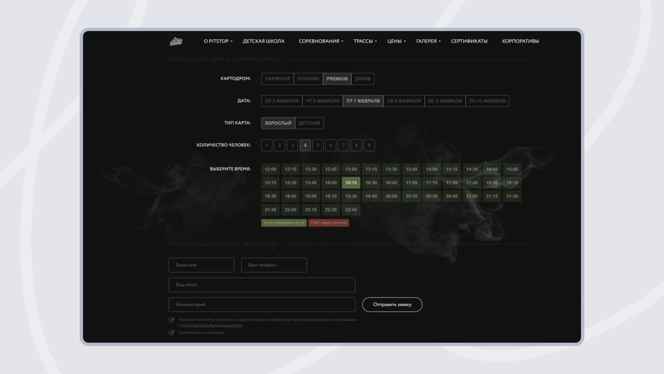 В результате комплексной работы над сайтом сети картинг-клубов PitStop Karting была успешно реализована многофункциональная и гибкая система онлайн-бронирования, которая учитывает разнообразные условия.