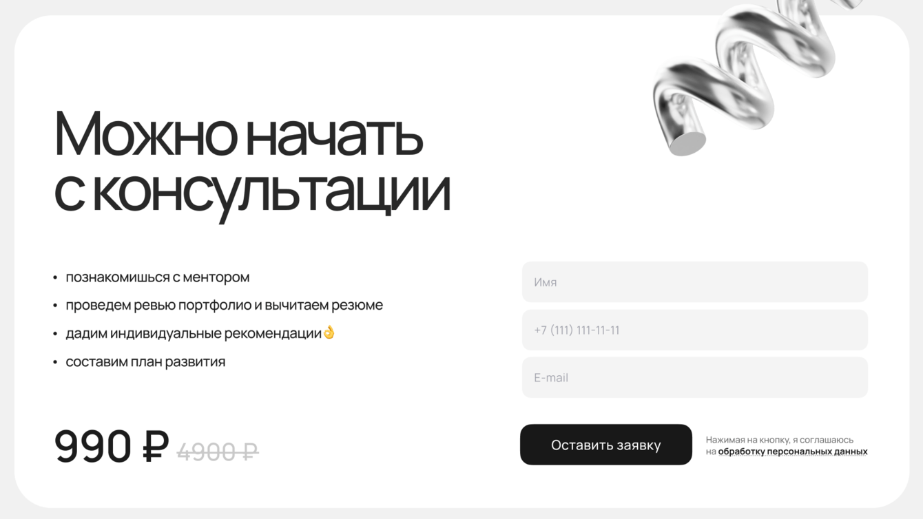 Блок для регистрации на консультацию — это трипваер. Консультация за 990 рублей, на ней ученик успевает лично познакомиться с понравившимся ментром, зафиксировать собственный профессиональный уровень, накидать поверхностный план дальнейших действий.