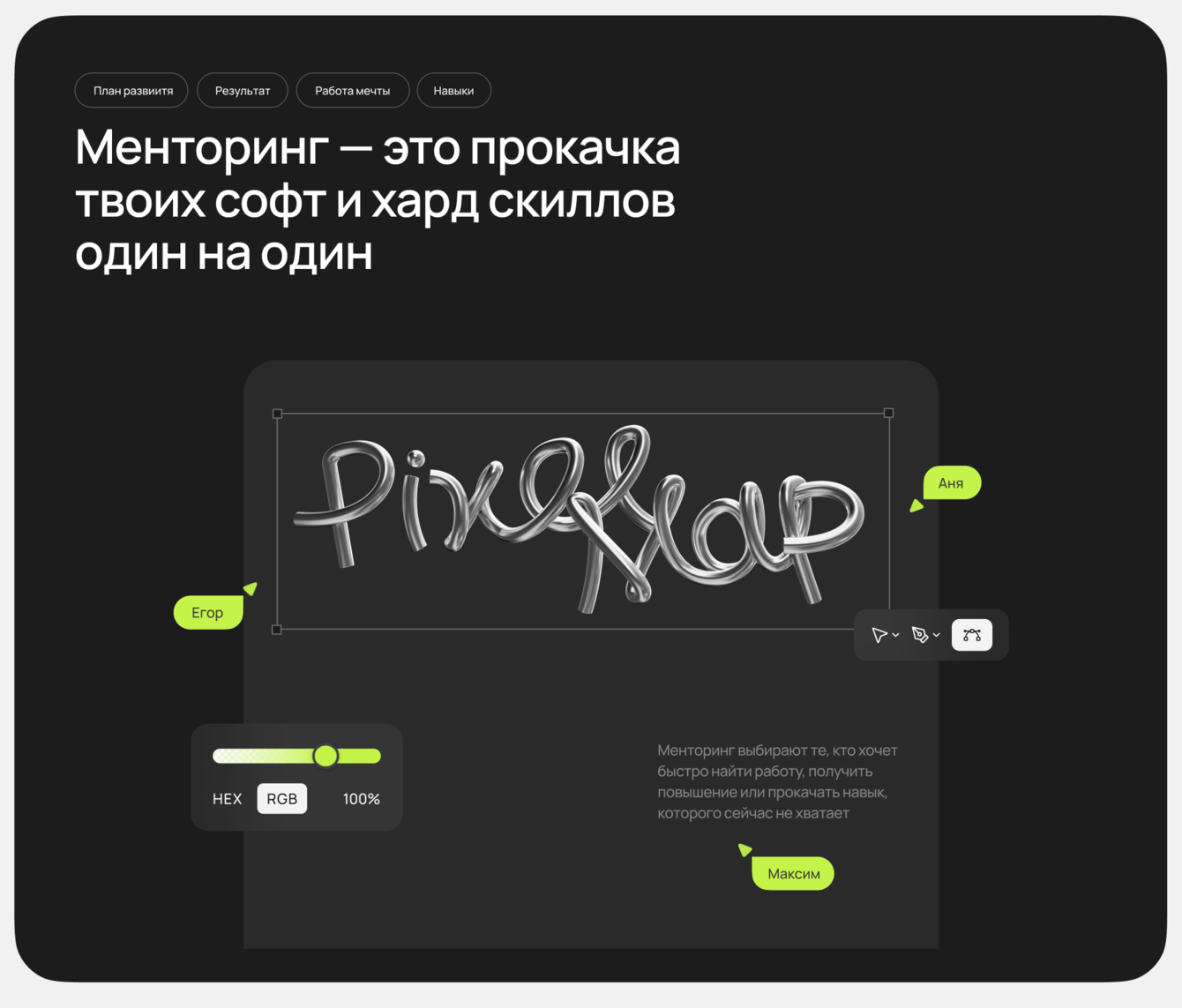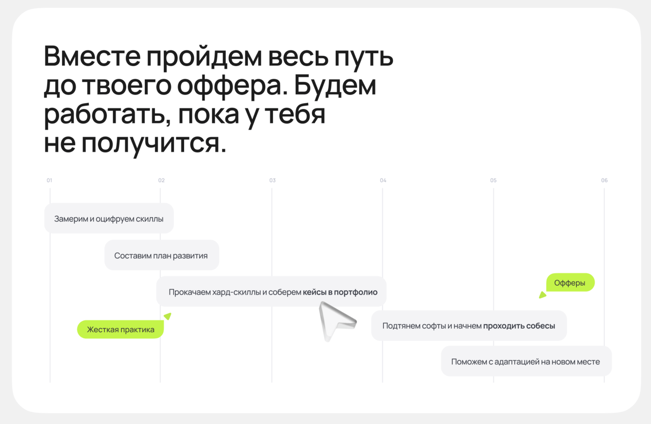 Дальше начинается работа: разбирается карта компетенций, идет подготовка к собеседованию, создаются макеты для портфолио. Если говорить просто — это индивидуальное наставничество.